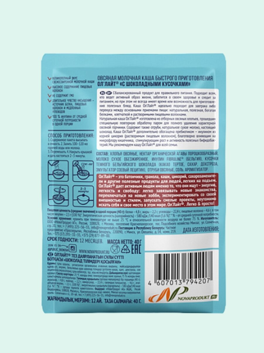 СохранитьОвсяная каша быстрого приготовления без сахара с шоколадными кусочками Ол лайт, 22 шт по 40 г интересное: