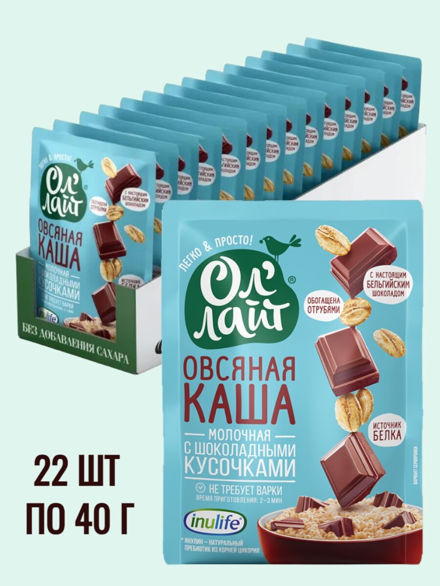 Купить Овсяная каша быстрого приготовления без сахара с шоколадными кусочками Ол лайт, 22 шт по 40 г