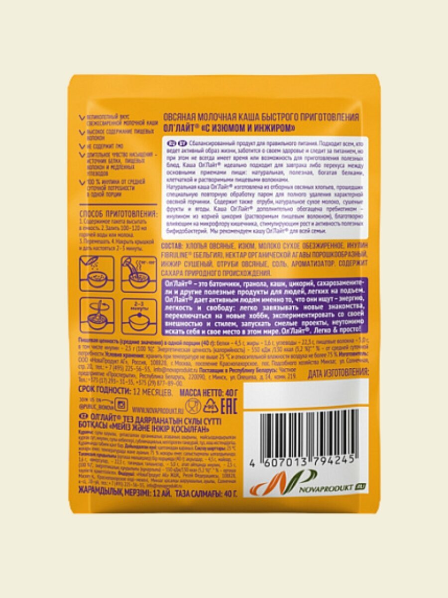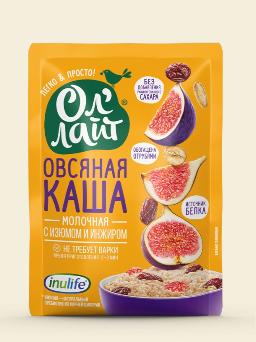 Овсяная молочная каша быстрого приготовления "Ол'Лайт" с изюмом и инжиром в пакетиках 22шт по 40г.