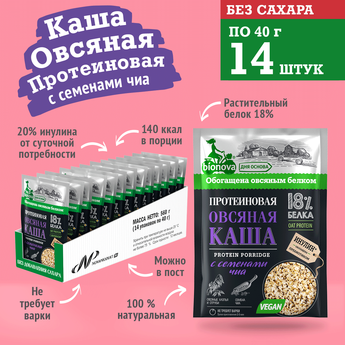 Купить BIONOVA Протеиновая овсяная каша быстрого приготовления в пакетикахс семенами чиа, порционная, 14 пак. по 40 г