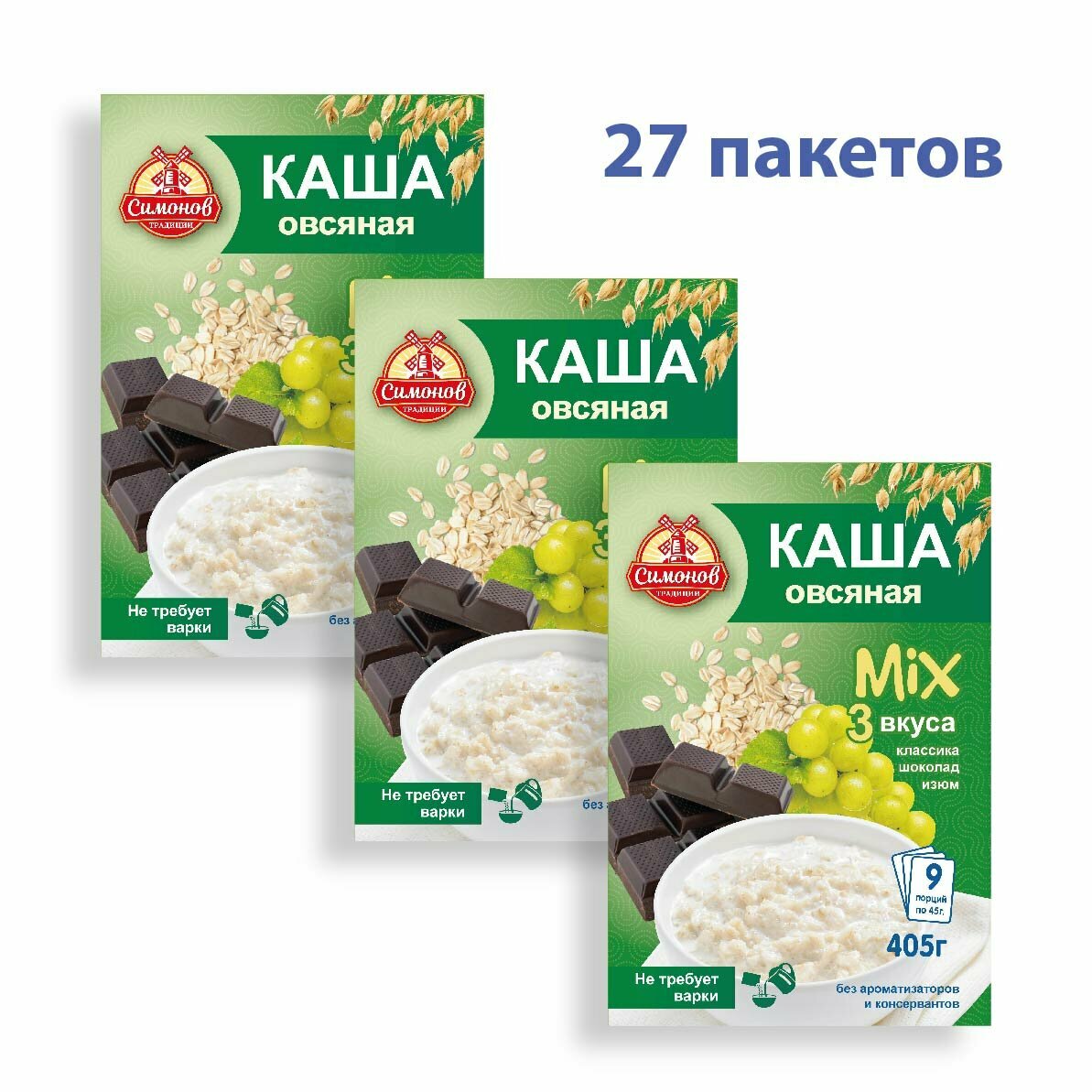 Купить Каша овсяная быстрого приготовления Симонов традиции шоколад/изюм/классика, порционная, 27 пакетиков по 45 грамм