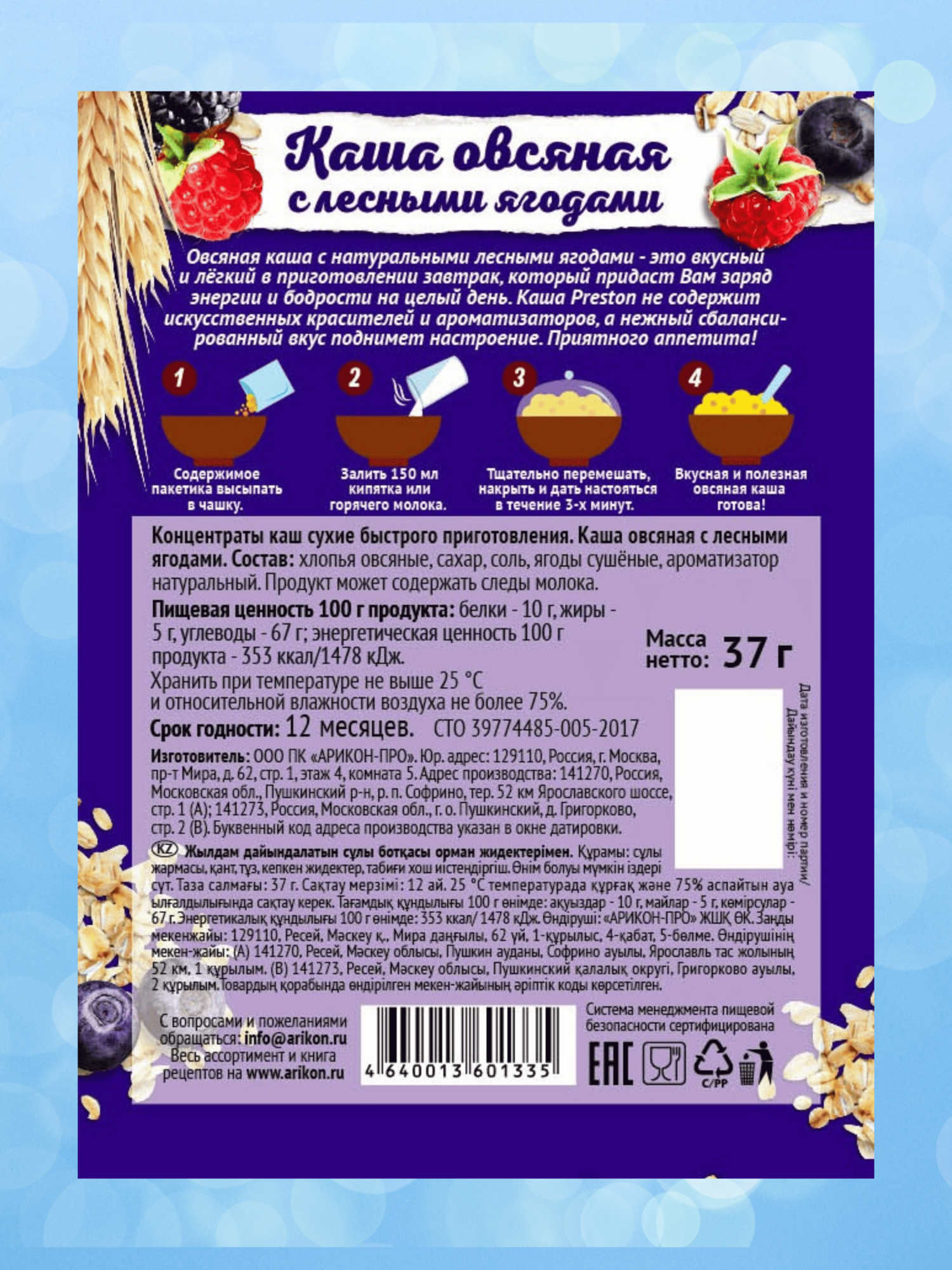 Каша овсяная быстрого приготовления Preston с лесными ягодами, в пакетиках 37 г, 20 шт.
