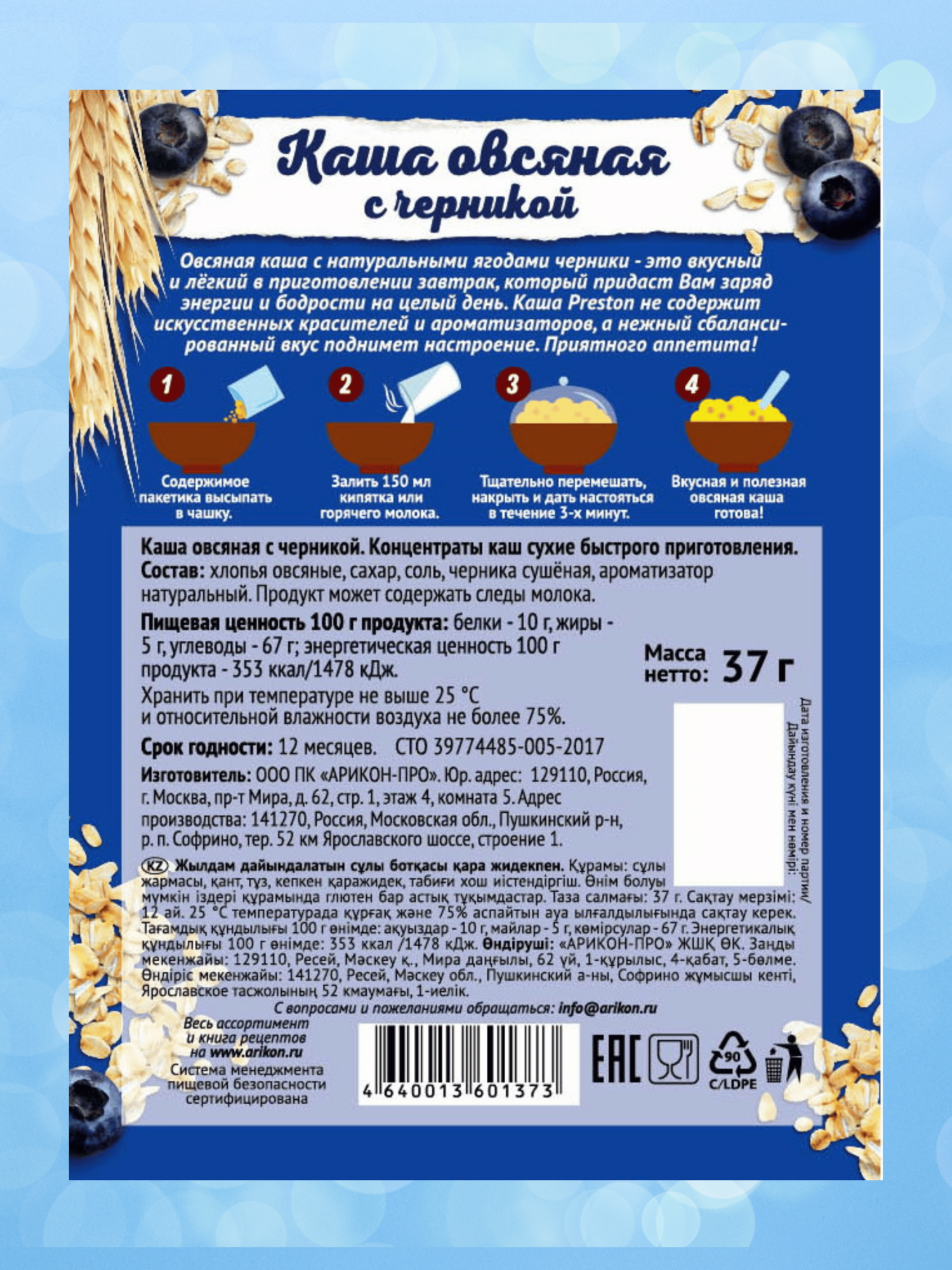 Каша овсяная быстрого приготовления Preston с черникой, в пакетиках 37 г, 10 шт.