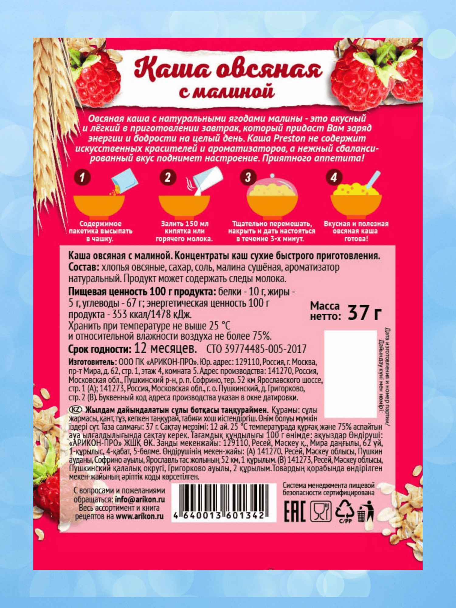Каша овсяная быстрого приготовления Preston с малиной, в пакетиках 37 г, 30 шт.
