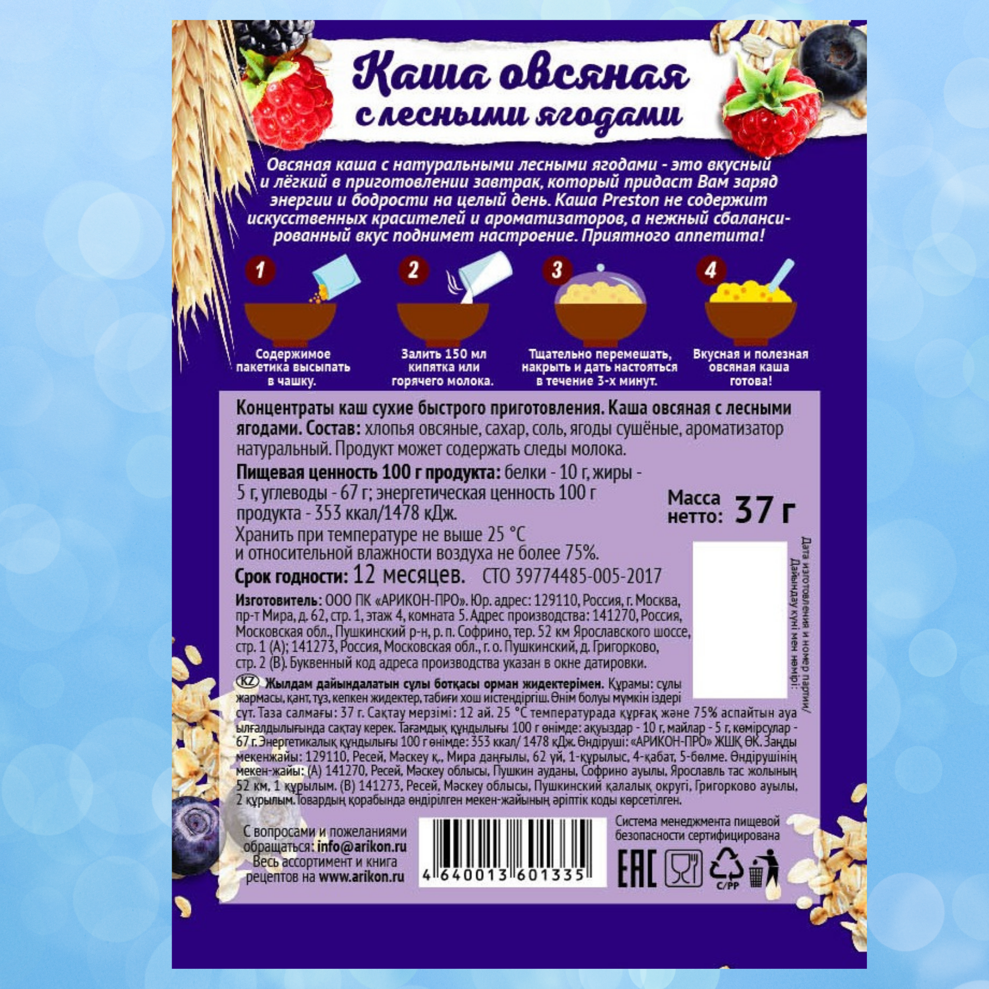 Каша овсяная быстрого приготовления Preston с лесными ягодами, в пакетиках 37 г, 20 шт.
