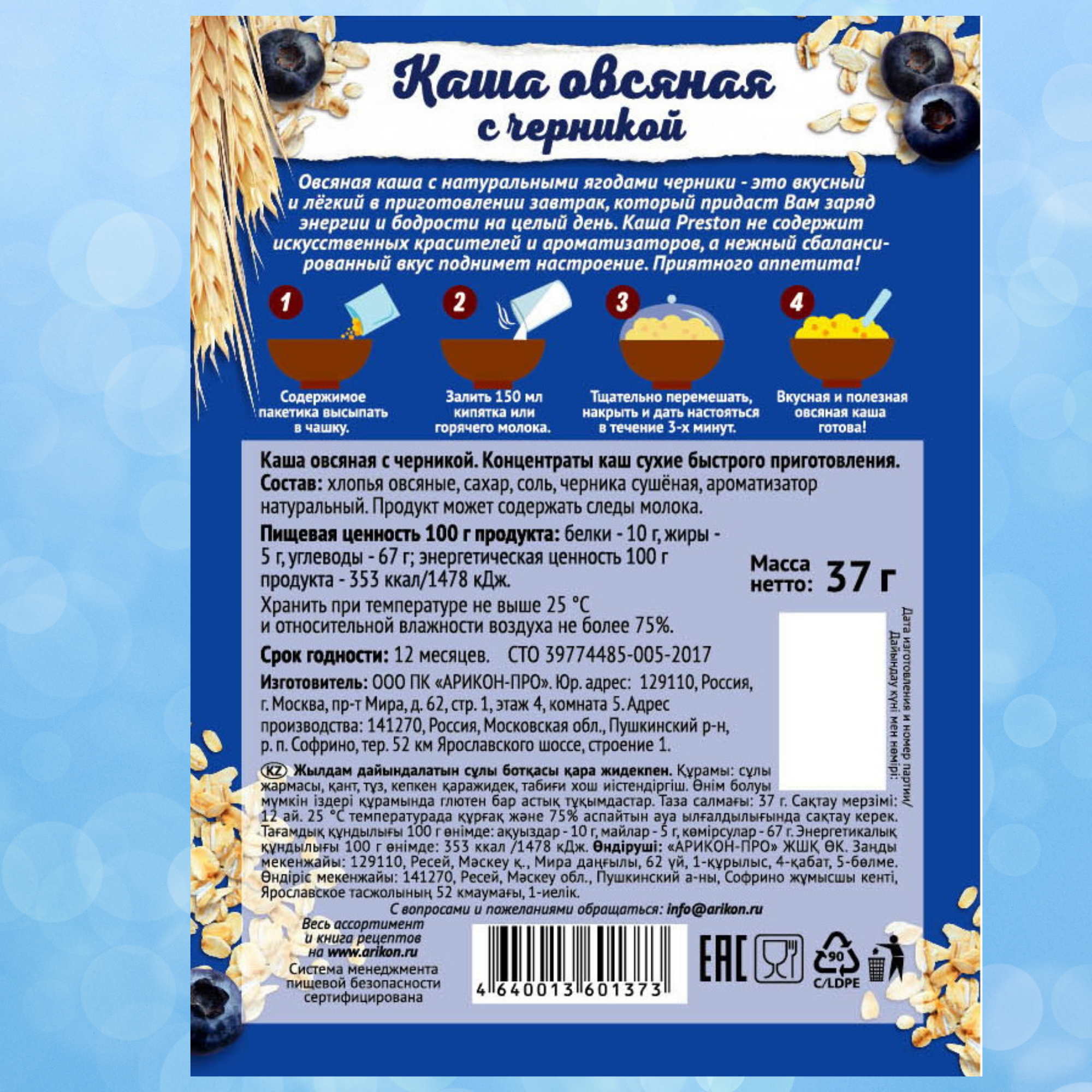 Каша овсяная быстрого приготовления Preston с черникой, в пакетиках 37 г, 10 шт.