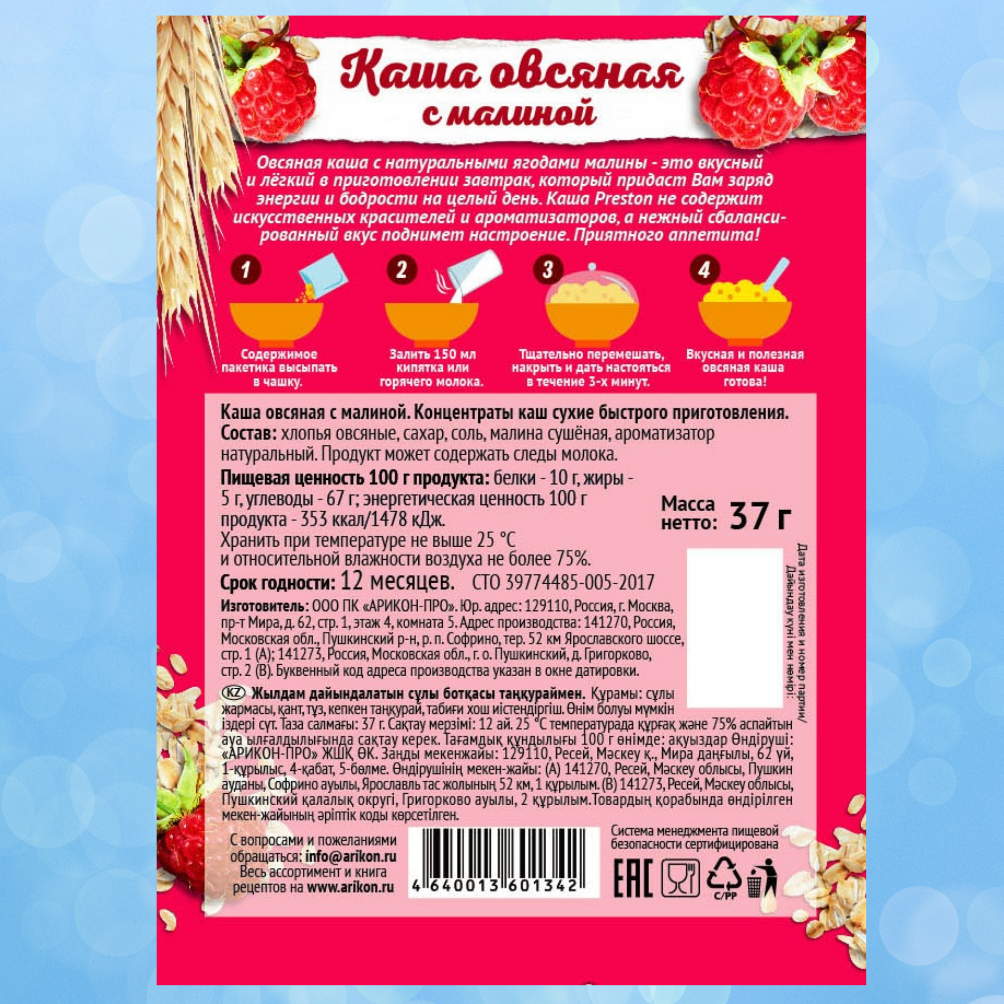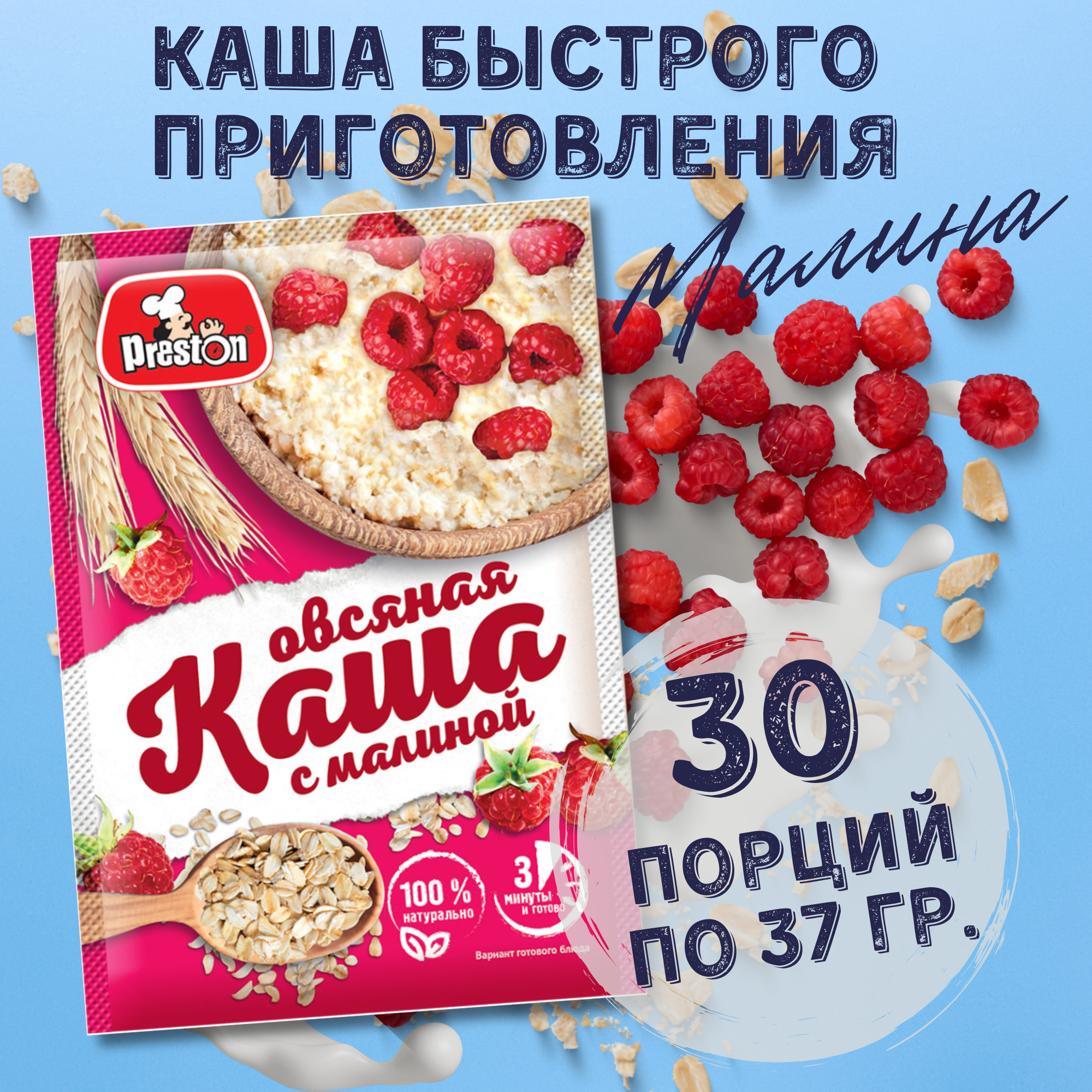 Каша овсяная быстрого приготовления Preston с малиной, в пакетиках 37 г, 20 шт.