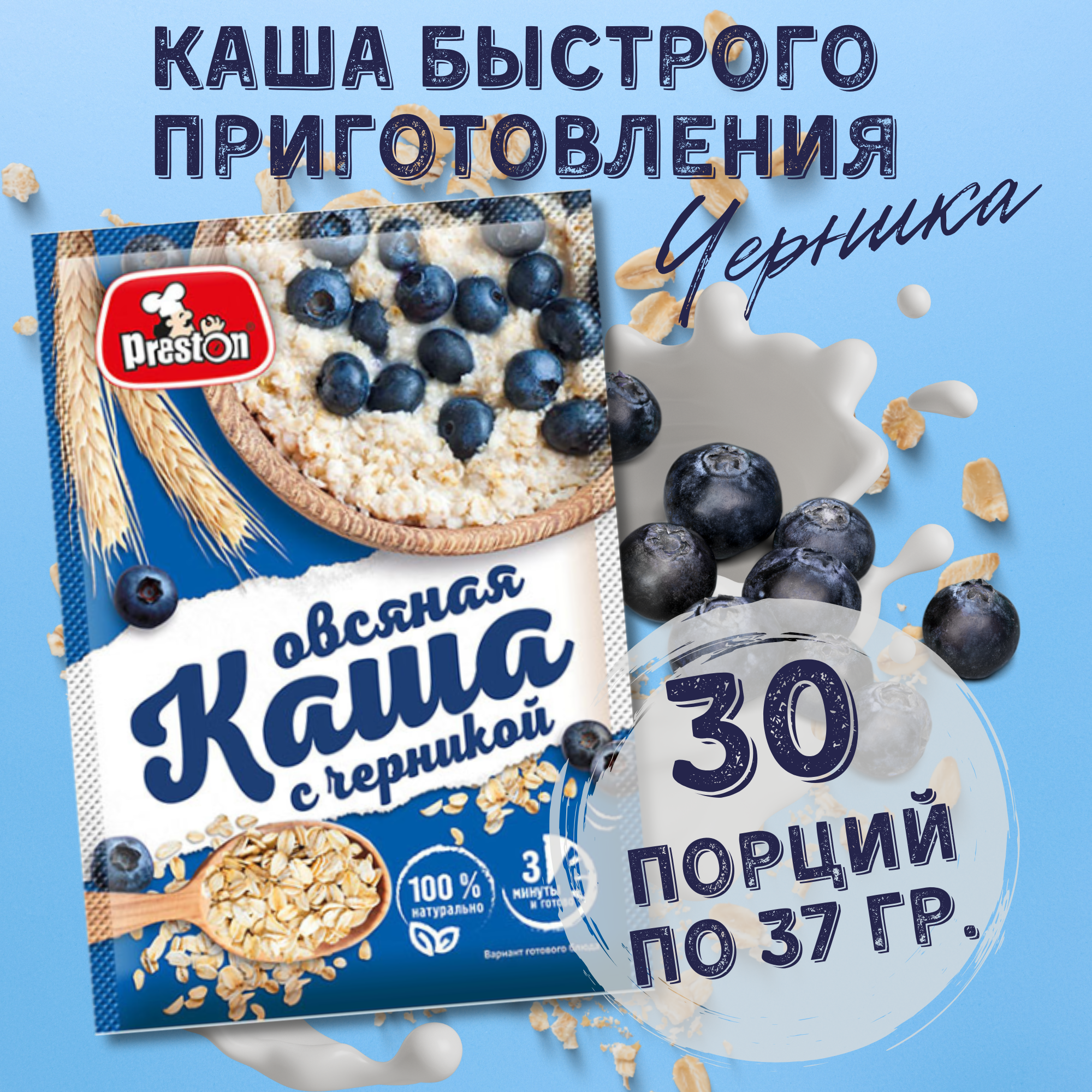 Каша овсяная быстрого приготовления Preston с черникой, в пакетиках 37 г, 10 шт.