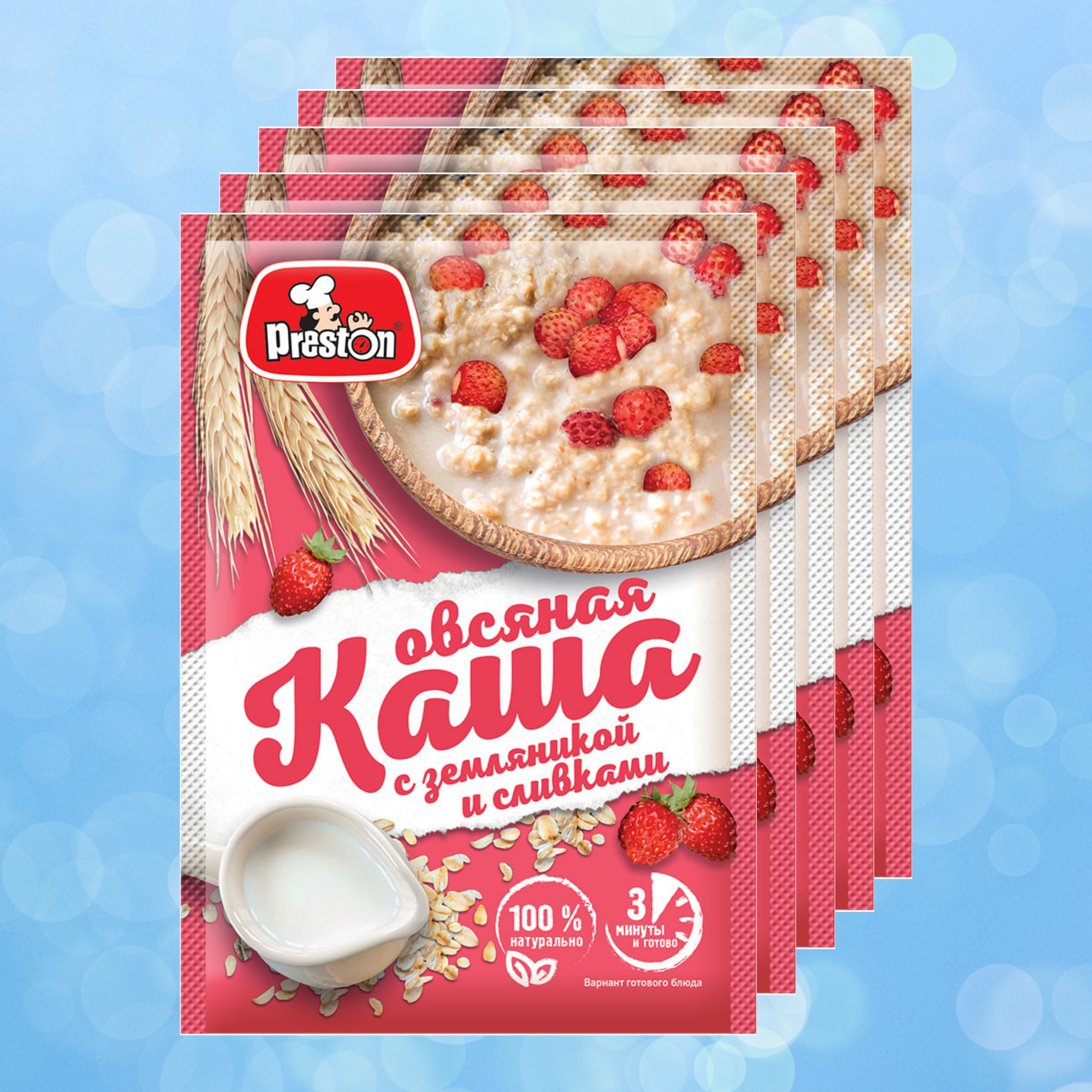 Каша овсяная быстрого приготовления Preston с земляникой и сливками, в пакетиках 37 г, 10 шт.