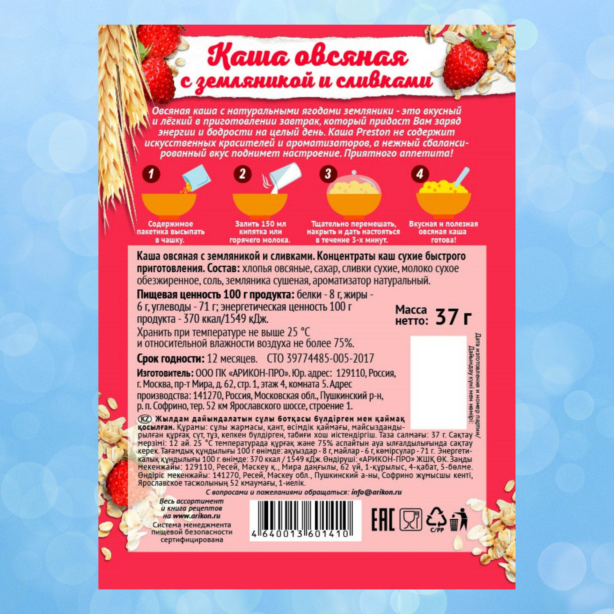 Каша овсяная быстрого приготовления Preston с Клубникой, в пакетиках 37 г, 10 шт.