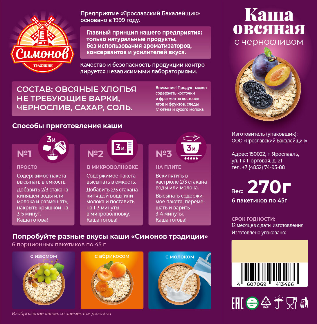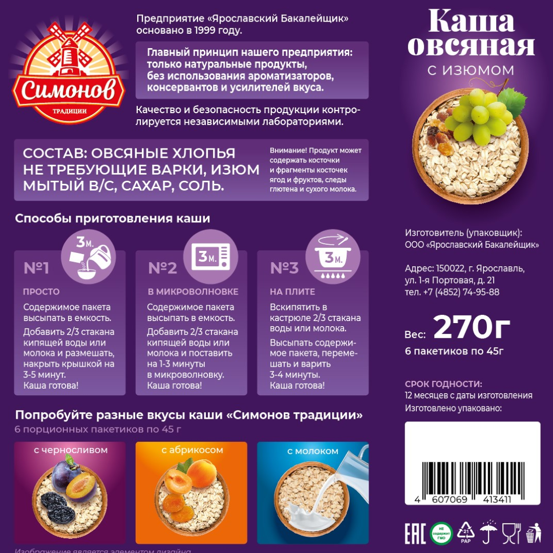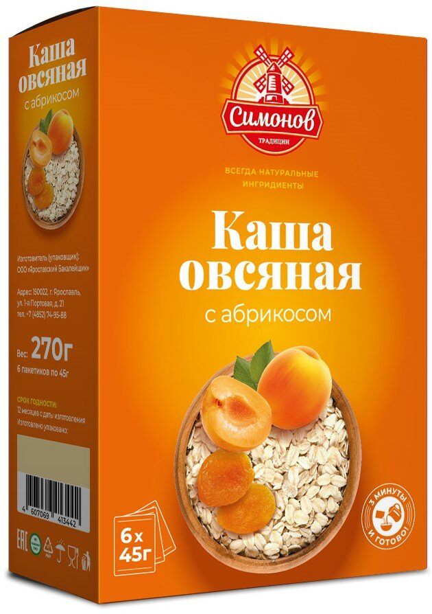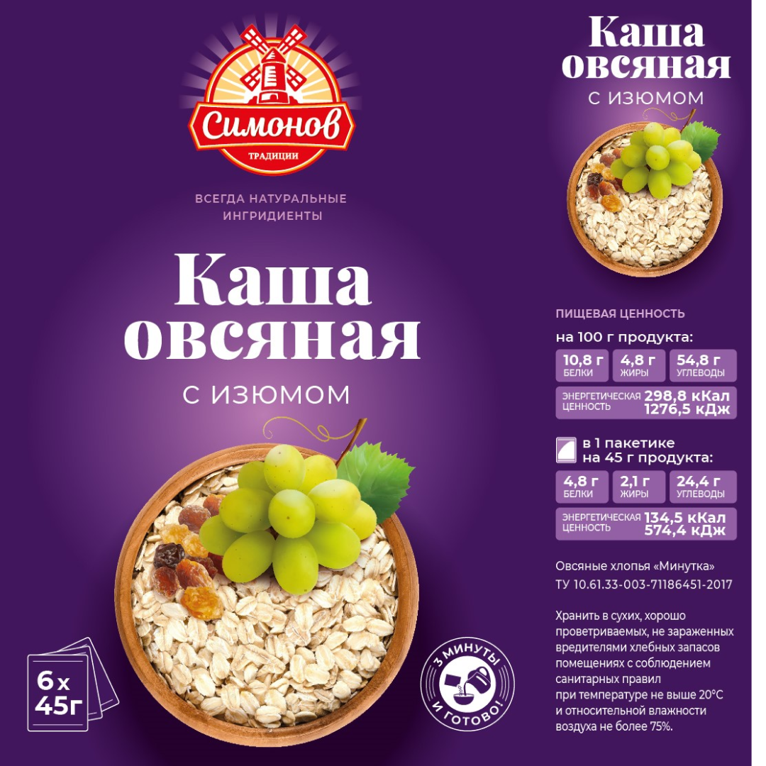 Каша овсяная быстрого приготовления Симонов традиции ассорти (абрикос, чернослив, изюм), порционная, 18 пакетиков по 45 грамм интересное: