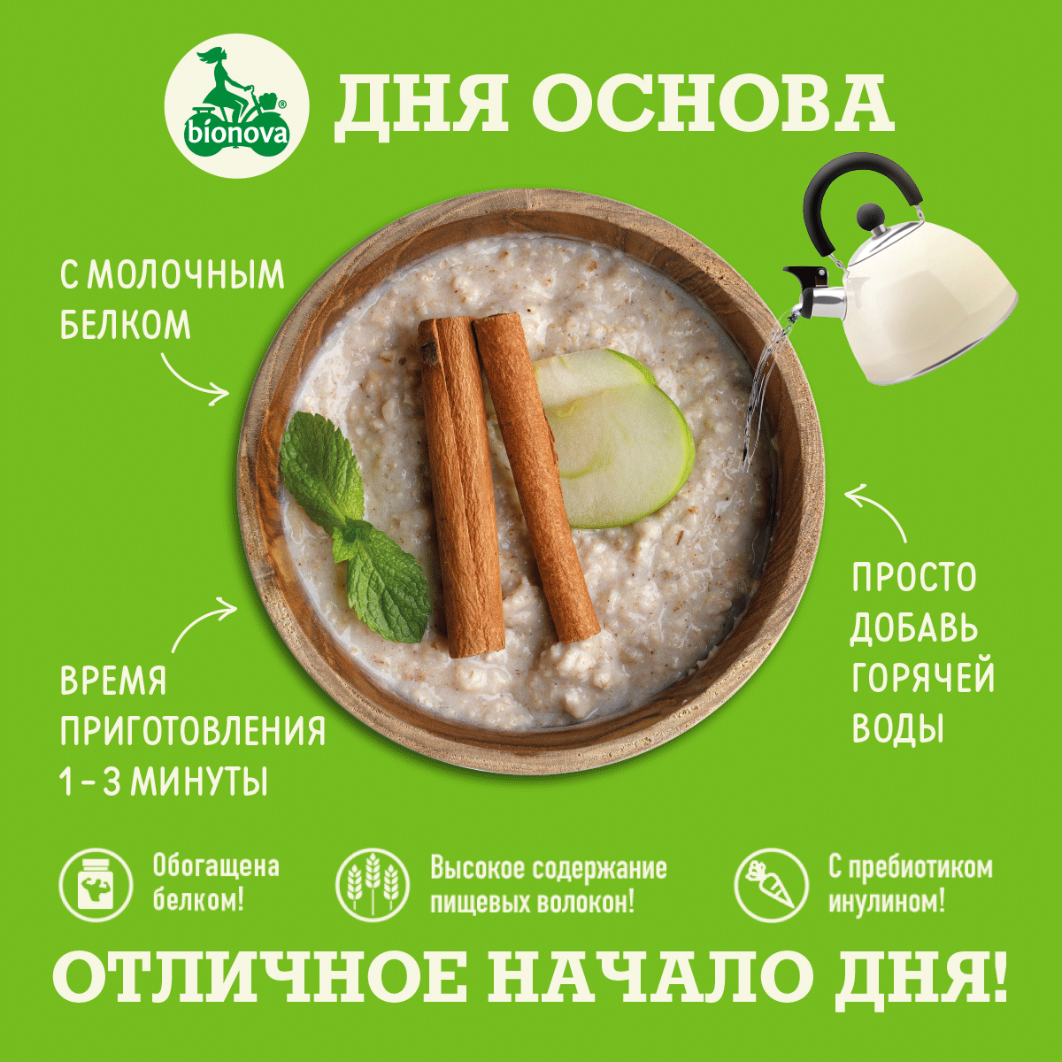 BIONOVA Протеиновая овсяная каша быстрого приготовления в пакетикахс яблоком и корицей, порционная, 14 пак. по 40 г интересное: