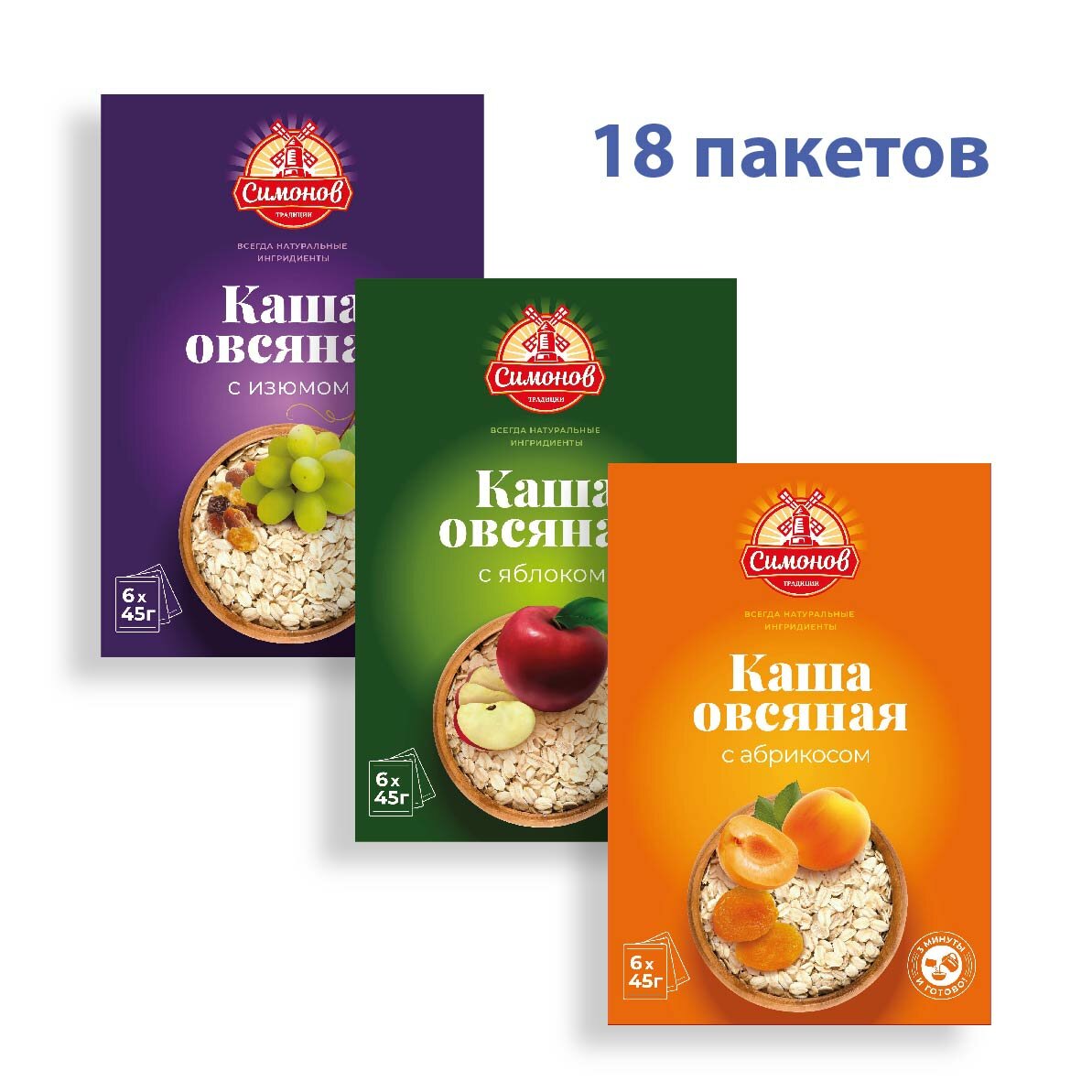 Купить Каша овсяная быстрого приготовления Симонов традиции ассорти (изюм, яблоко, абрикос), порционная, 18 пакетиков по 45 грамм