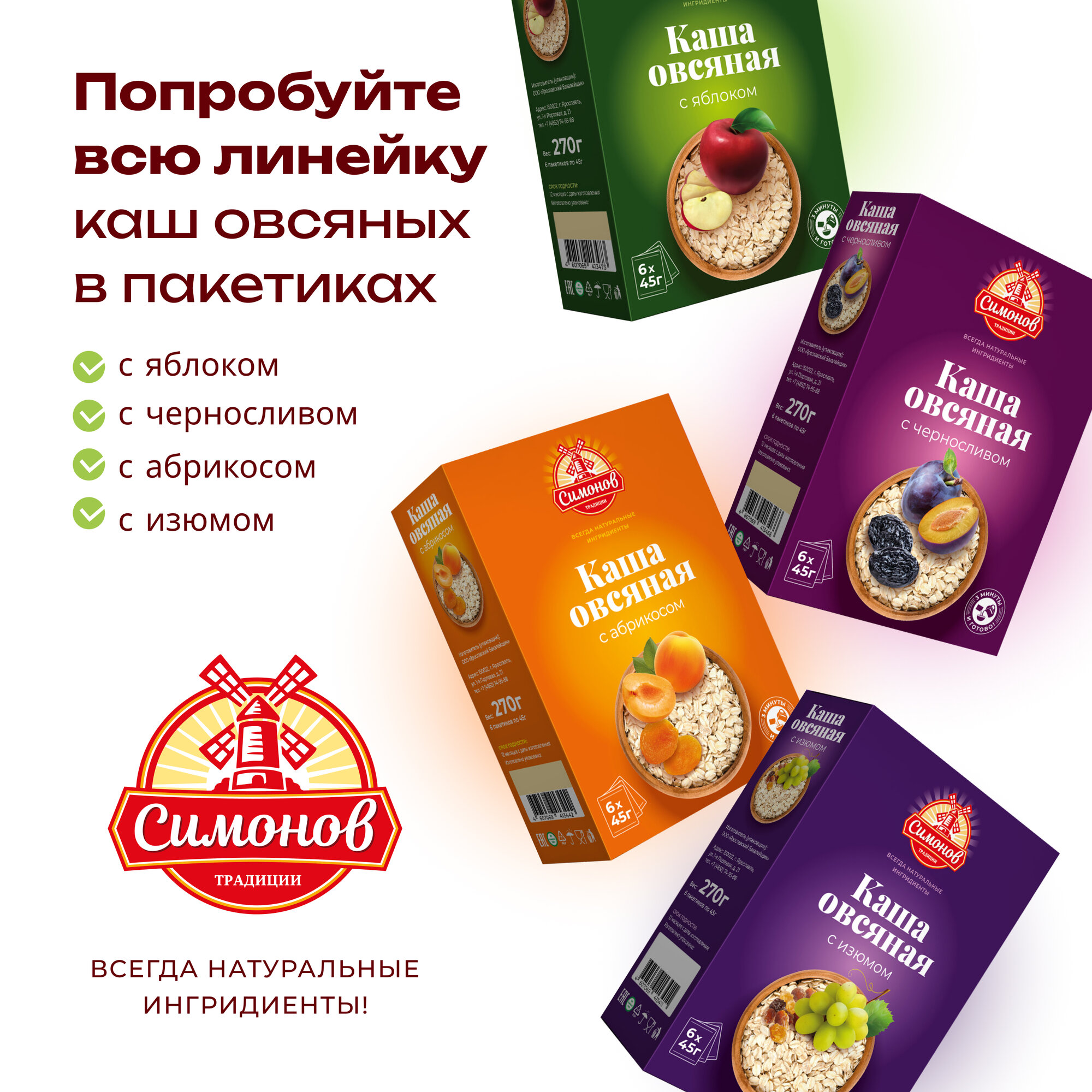 Каша овсяная быстрого приготовления Симонов традиции ассорти (чернослив, изюм, яблоко), порционная, 18 пакетиков по 45 грамм интересное: