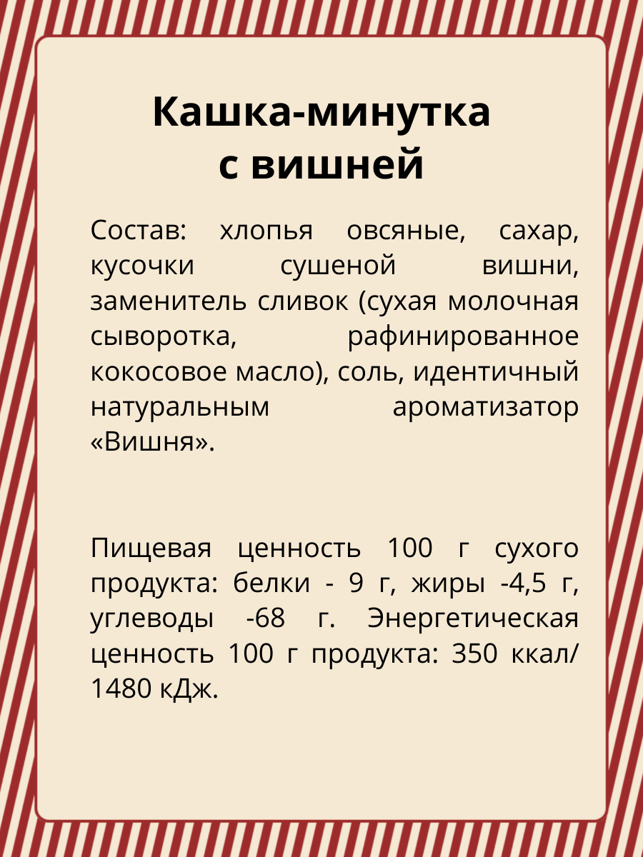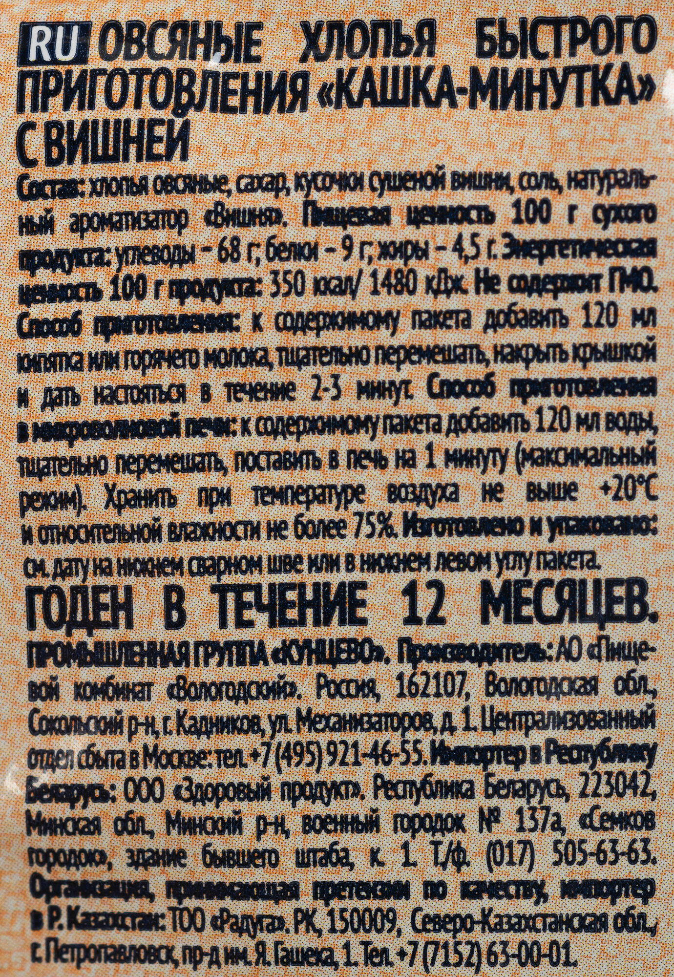 Овсяная каша быстрого приготовления "Кашка-Минутка" с вишней 25 штук по 37 г. интересное:
