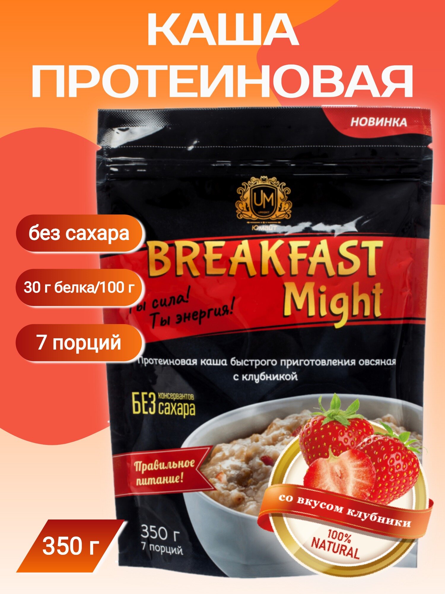 Купить Протеиновая каша быстрого приготовления овсяная "Breakfast Might" с клубникой, 350г