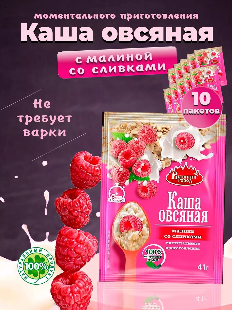 Овсяная каша Вышний город с малиной, со сливками, моментального приготовления, 5 пакетиков