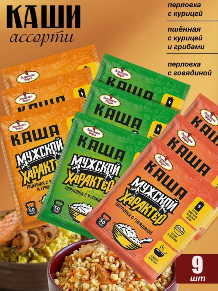 Купить Каша "Мужской характер" микс: перловая с курицей, перловая с говядиной, пшенная с курицей и грибами (9 шт х 50 г)