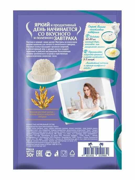 Каша быстрого приготовления рисовая Кокос 10 шт*30 гр интересное: