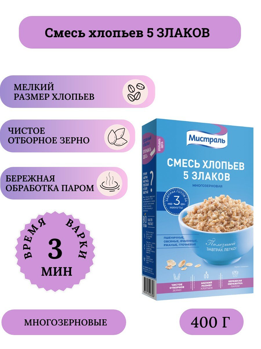 Хлопья Мистраль: Злаковый коктейль, 5 злаков, Геркулес Фермерский, Отруби Овсяные, 400 г * 4 шт интересное: