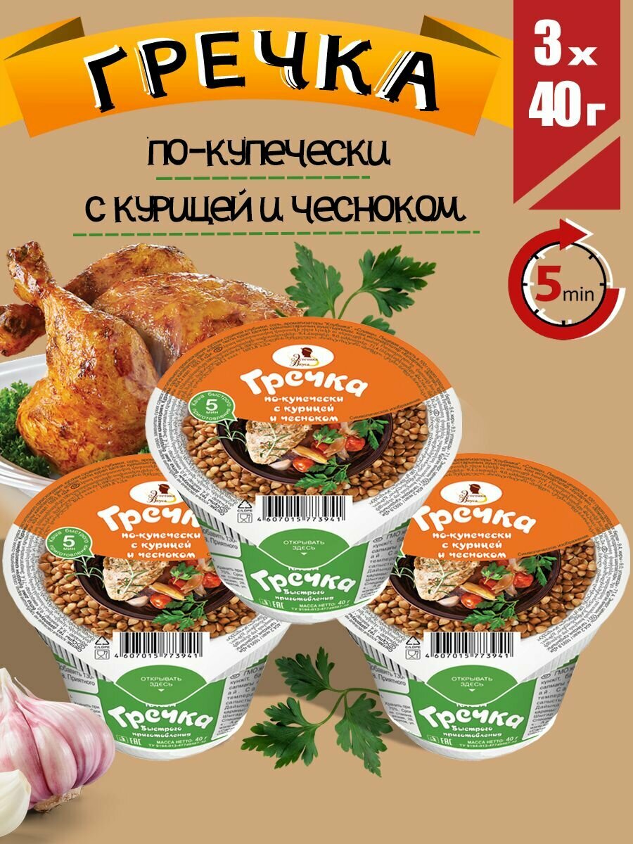 Купить Каша в стакане "Гречка по купечески с курицей и чесноком" 3 шт. по 40г