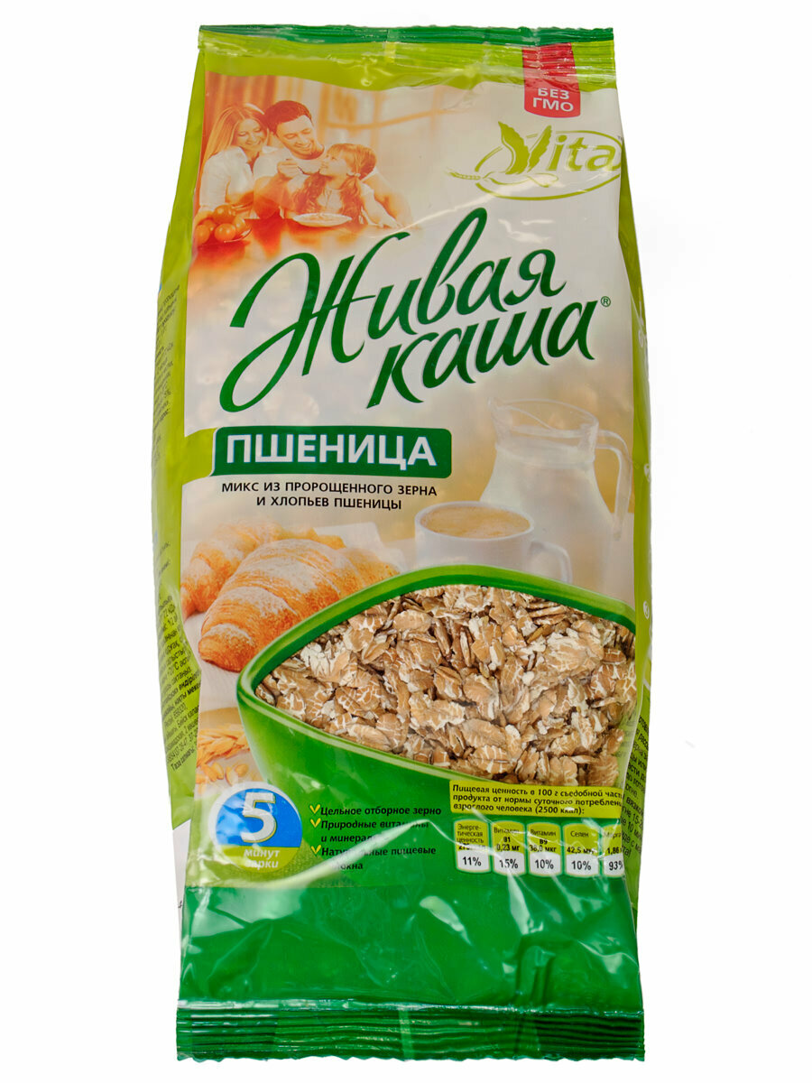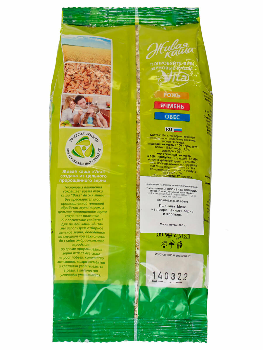 Живая каша. Пшеница. Хлопья цельнозерновые с проростками, в мягкой упаковке, комплект 2 шт. по 300 грамм, Vita Family интересное: