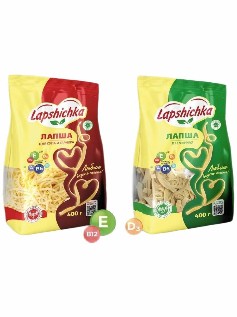 ЛАПША LAPSHICHKA "Для СУПА И ГАРНИРА", НАБОР 2 шт. по 400 г, ХАЛЯЛЬ, веган, из твердых сортов пшеницы, Россия