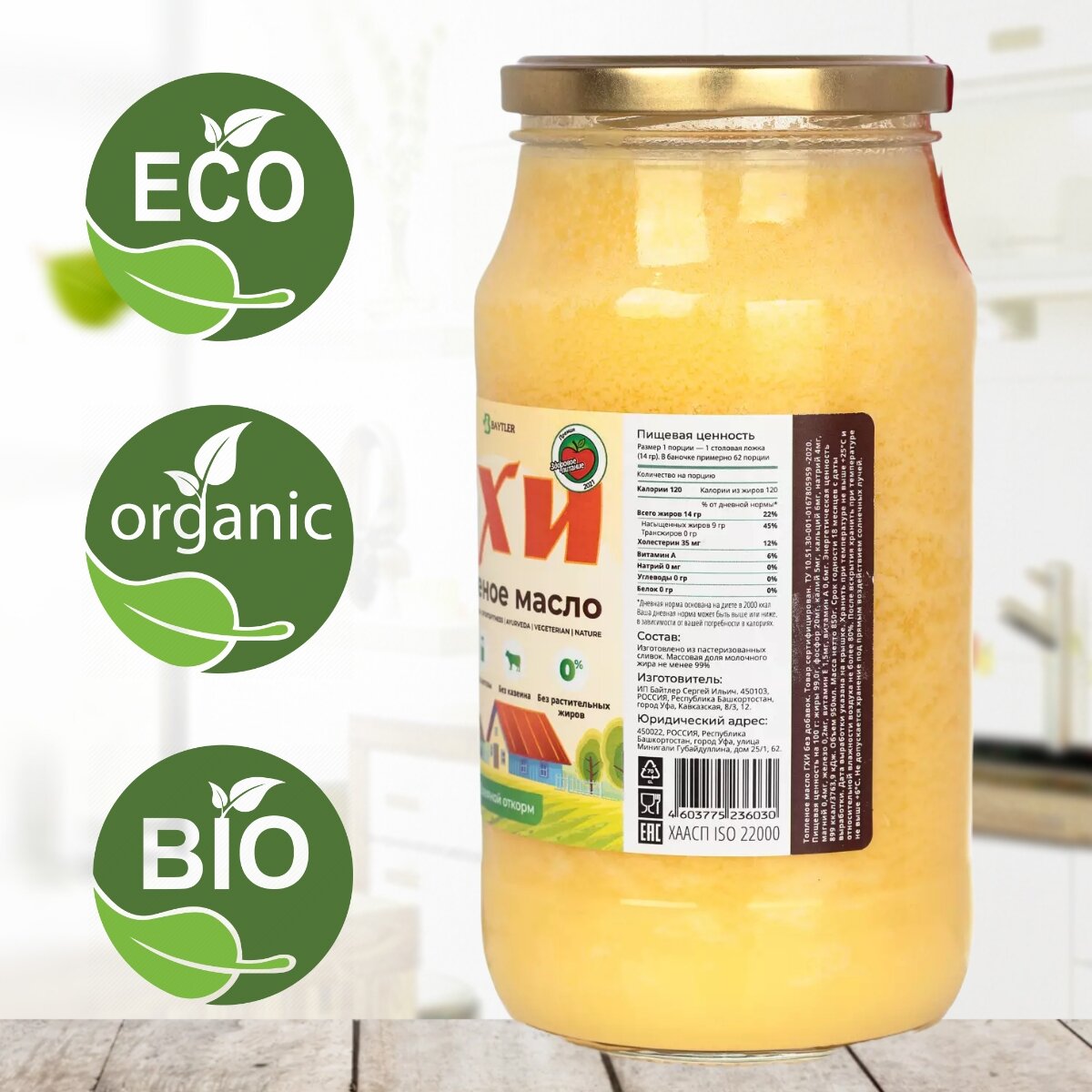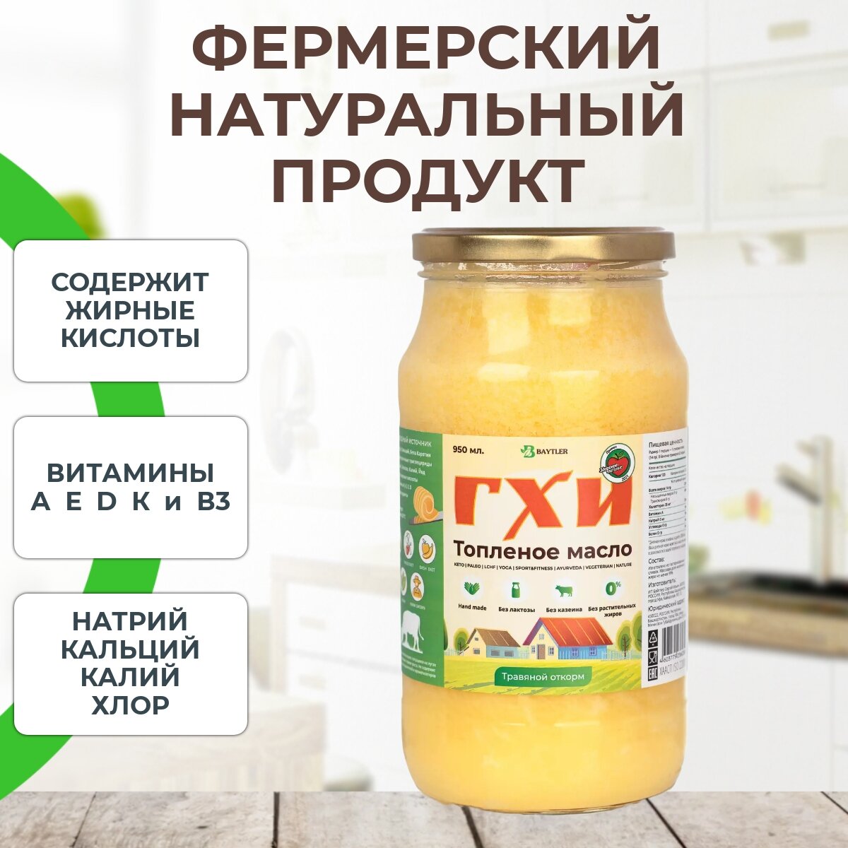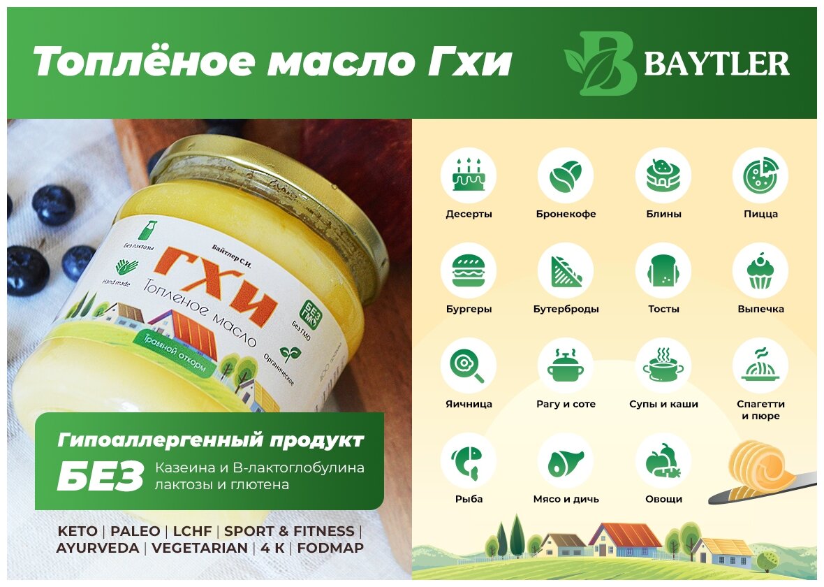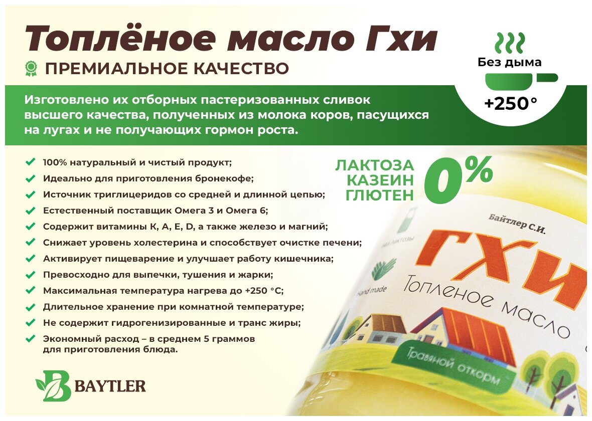 Масло ГХИ топленое, BAYTLER, жирность 99%, 950 мл, стеклянная банка. Сертифицировано: Эко, Био, Органик. интересное: