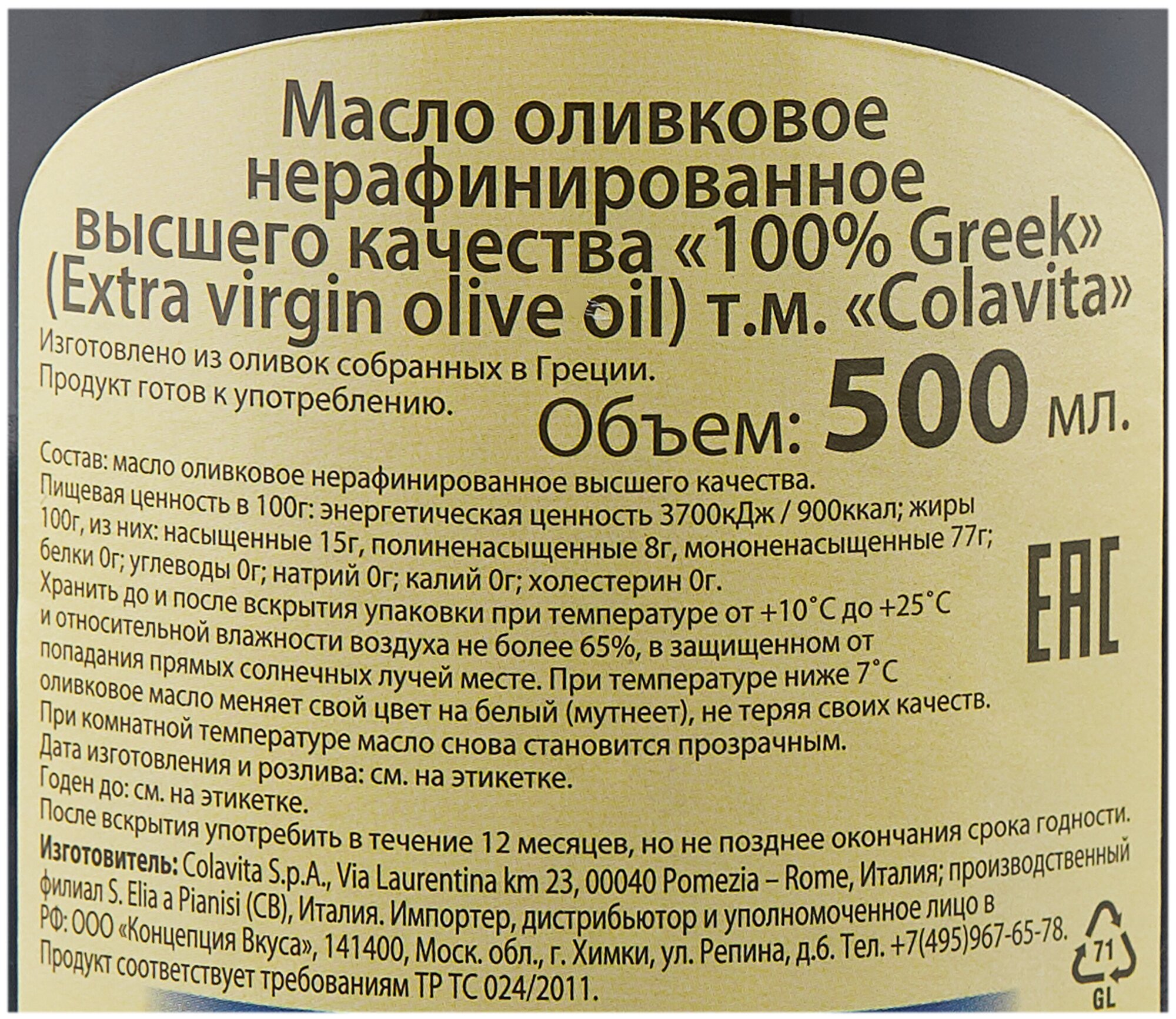 Масло оливковое COLAVITA нерафинированное E.V. "100% Greek" /стекло/ 0,5л интересное: