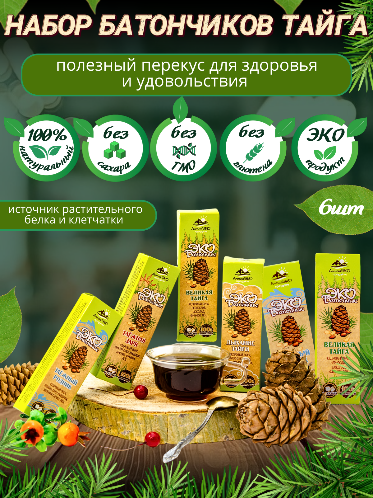 Набор натуральных батончиков "Тайга", 6 шт. по 45 г, без сахара, Алтай-Эко Продукт интересное: