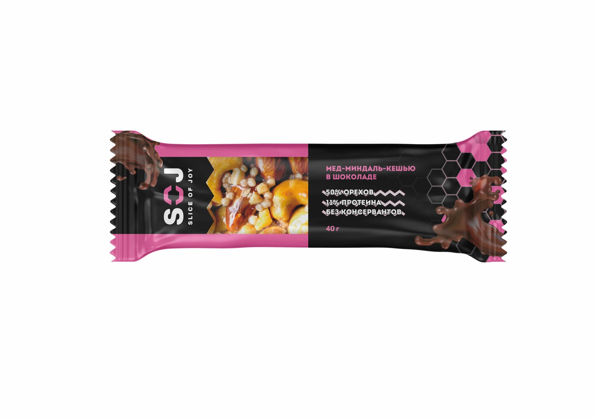 Купить SOJ, Протеиновые батончики, Мед миндаль кешью с шоколадом, 20шт х 40г