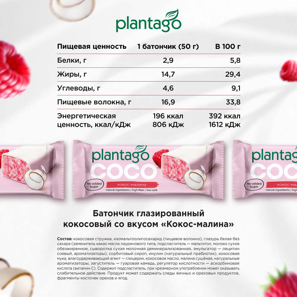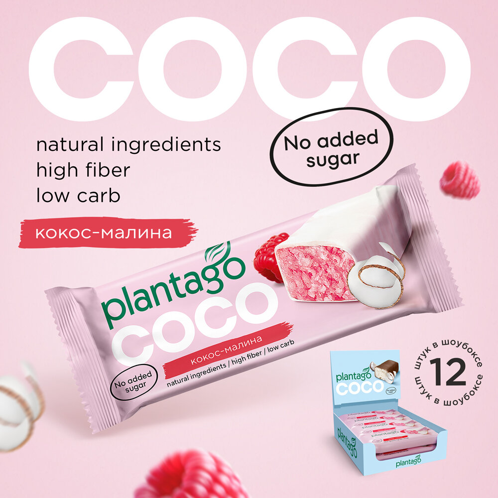 Батончик "Plantago" COCO, без сахара с малиновым вкусом, 50г,12шт интересное: