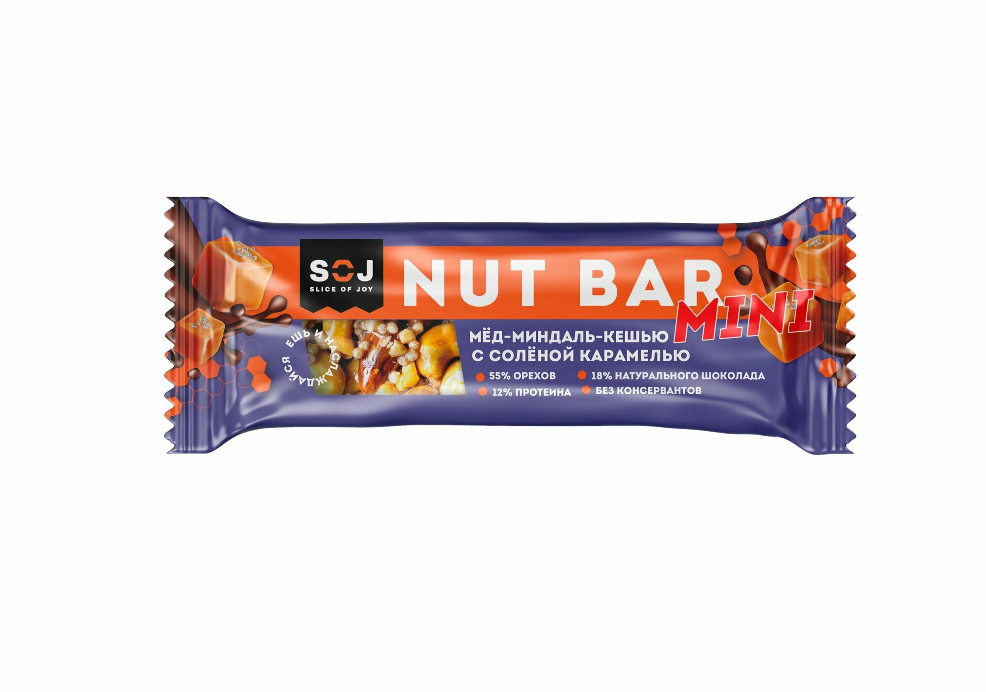 SOJ Nut bar mini, Протеиновые батончики, Мед миндаль кешью с шоколадом и соленой карамелью, 20 шт по 30г интересное: