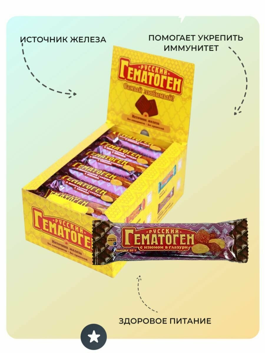 Гематоген Русский (шоколадная глазурь, изюм) 40 г (в наборе 24 шт.) интересное: