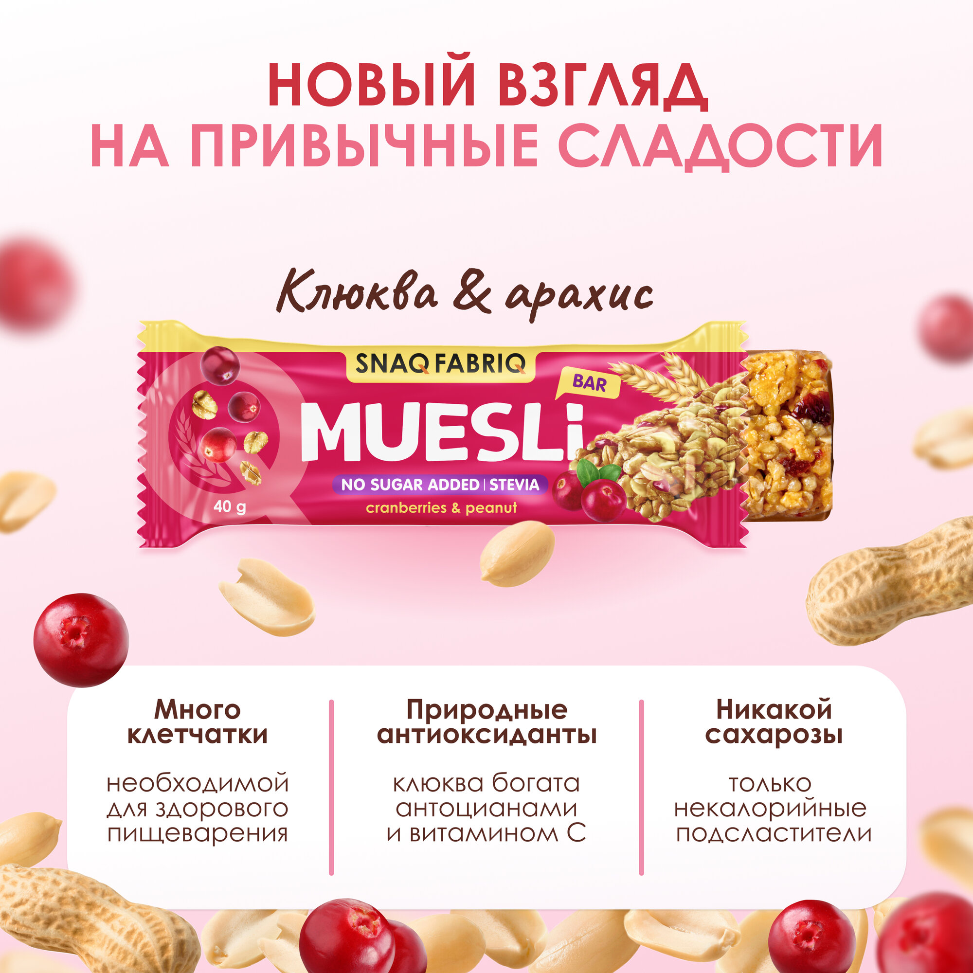 Батончики мультизлаковые без сахара SNAQ FABRIQ Мюсли с арахисом и клюквой, 12шт х 40г интересное: