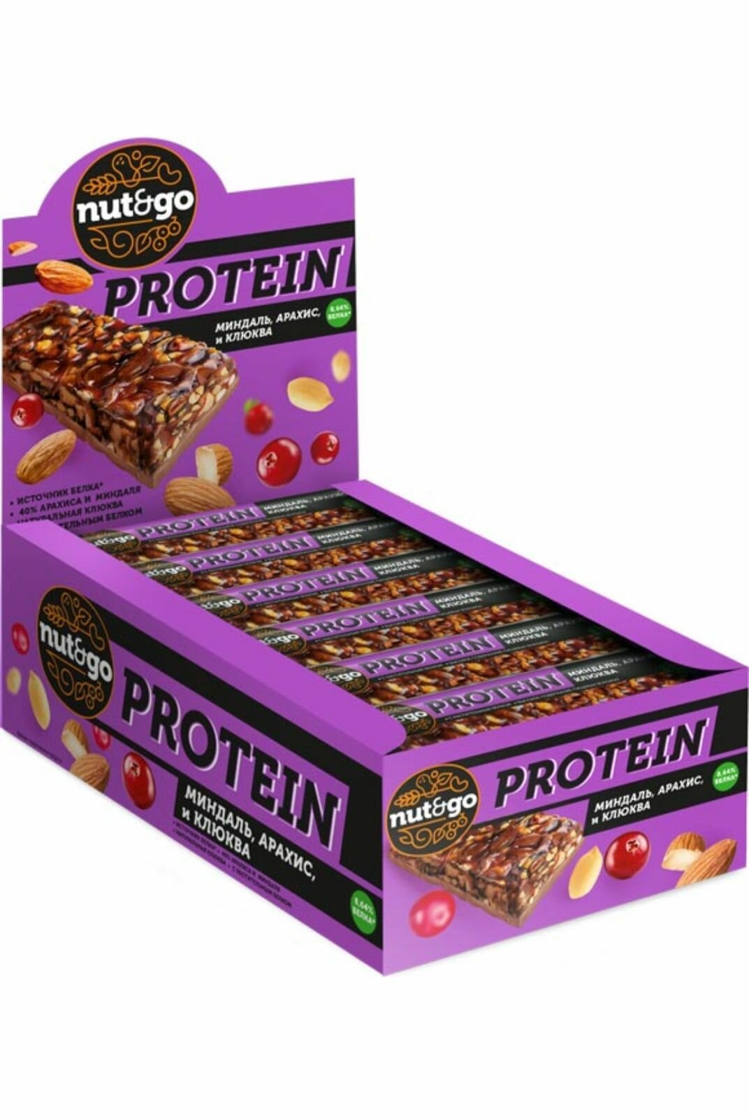Купить Nut&Go , батончик Protein миндаль, арахис, клюква, 36 г (упаковка 18 шт)