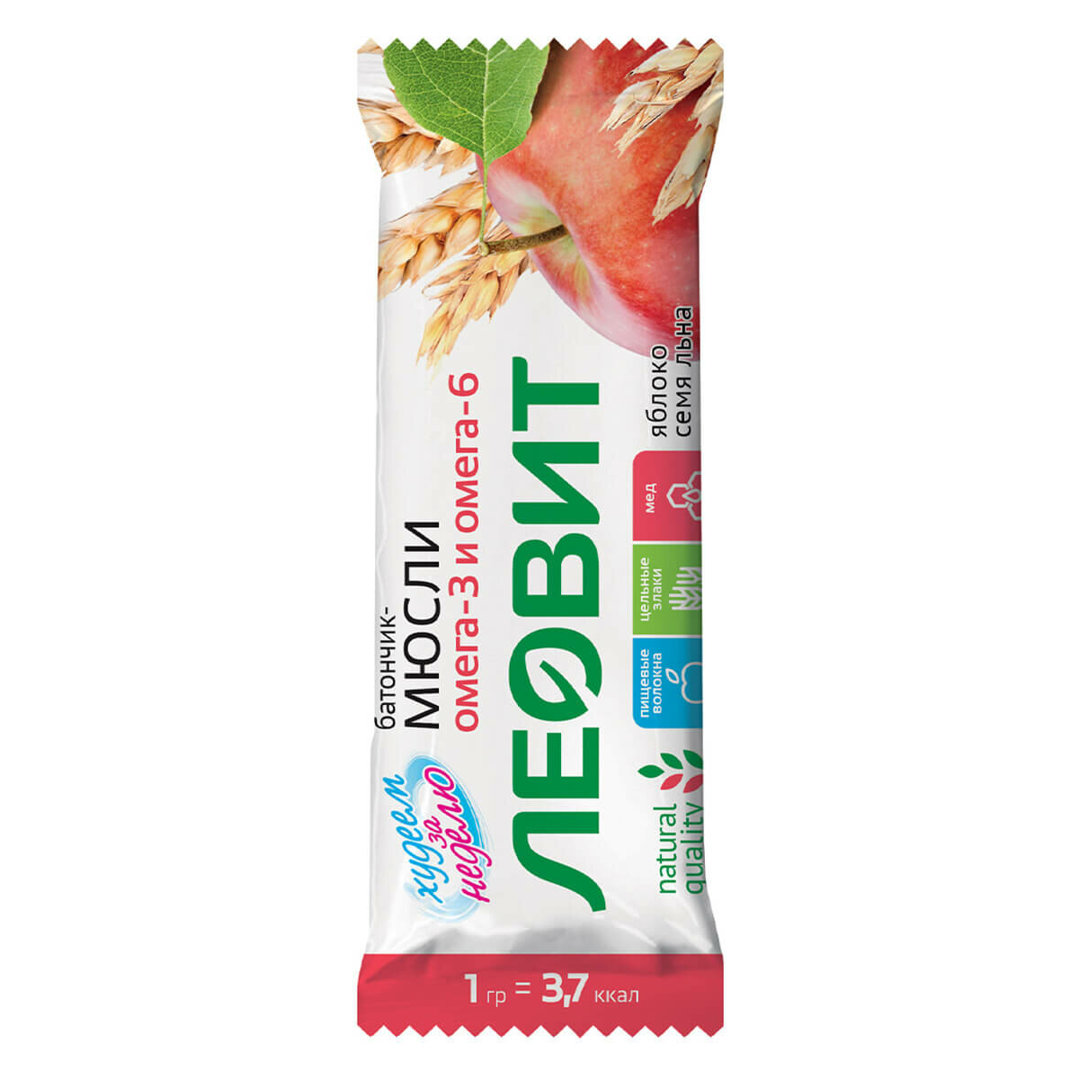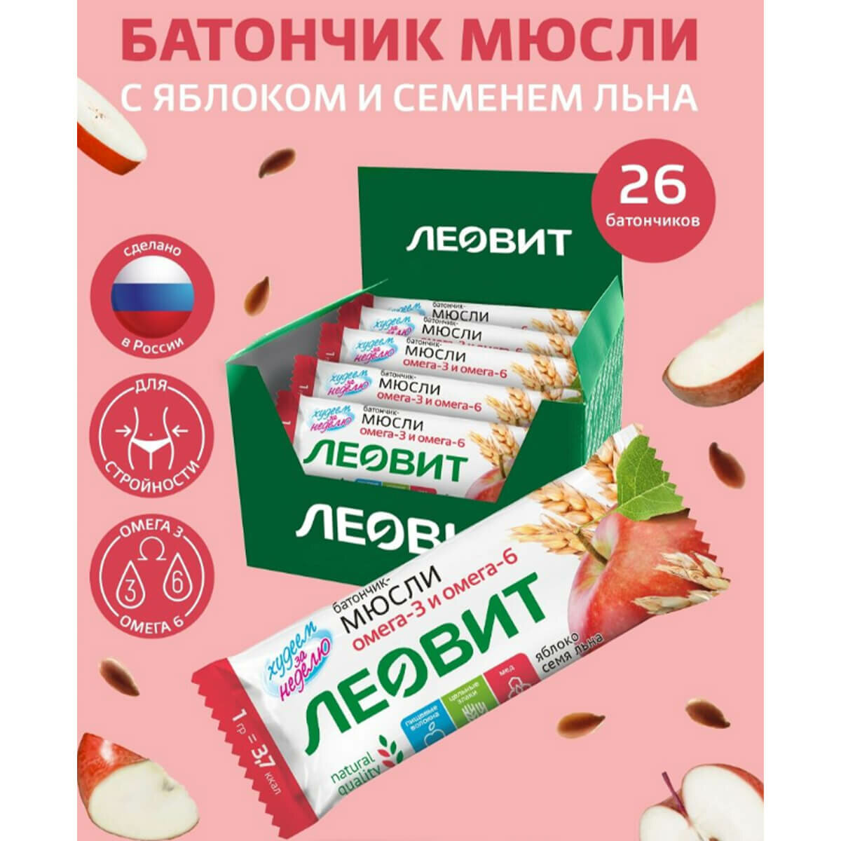 Батончик-мюсли с яблоком и семенем льна, 26 шт по 30 г, леовит интересное: