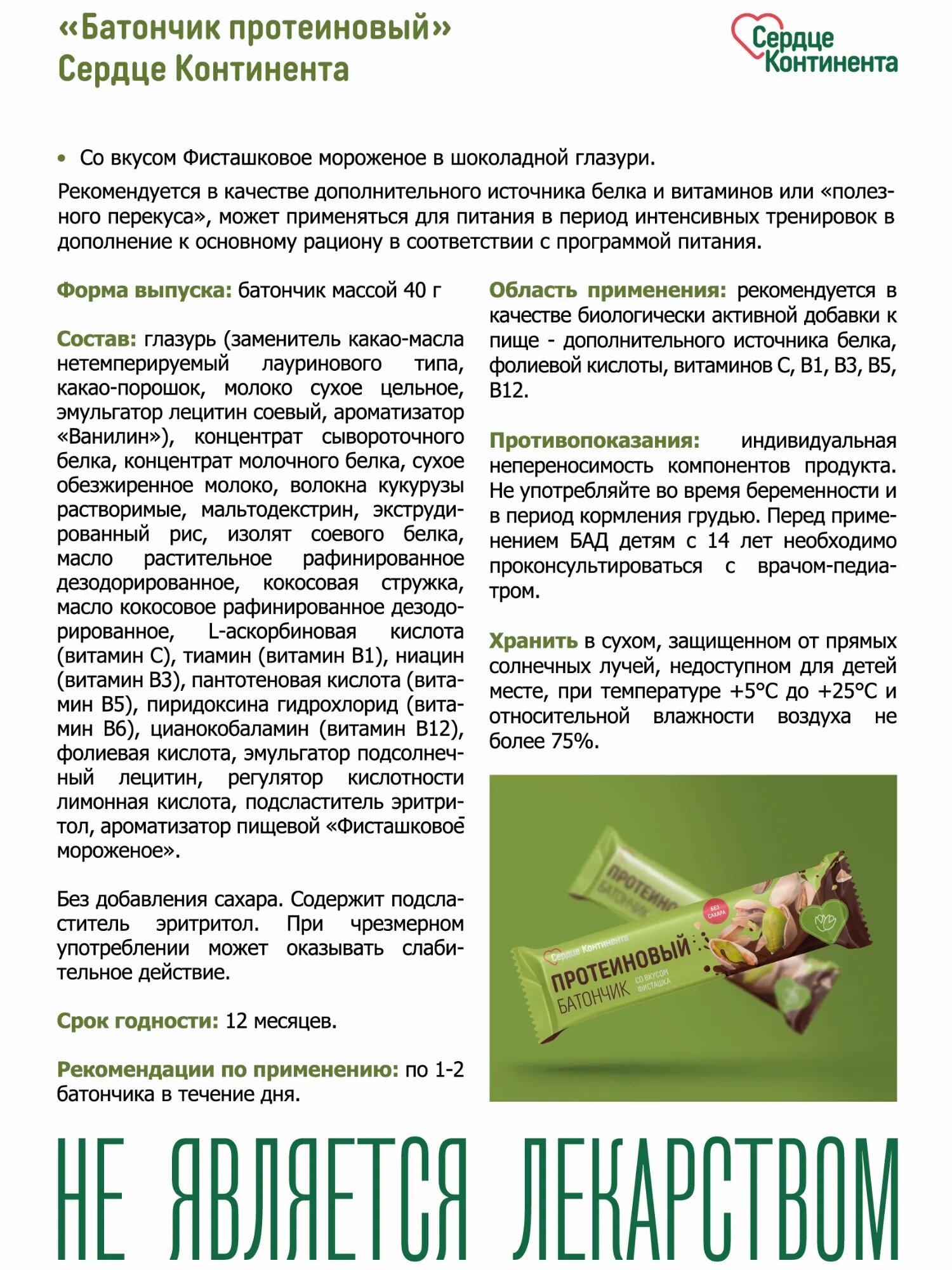Батончик Протеиновый Сердце Континента Фисташк. морож. в шок. глаз. 40г интересное: