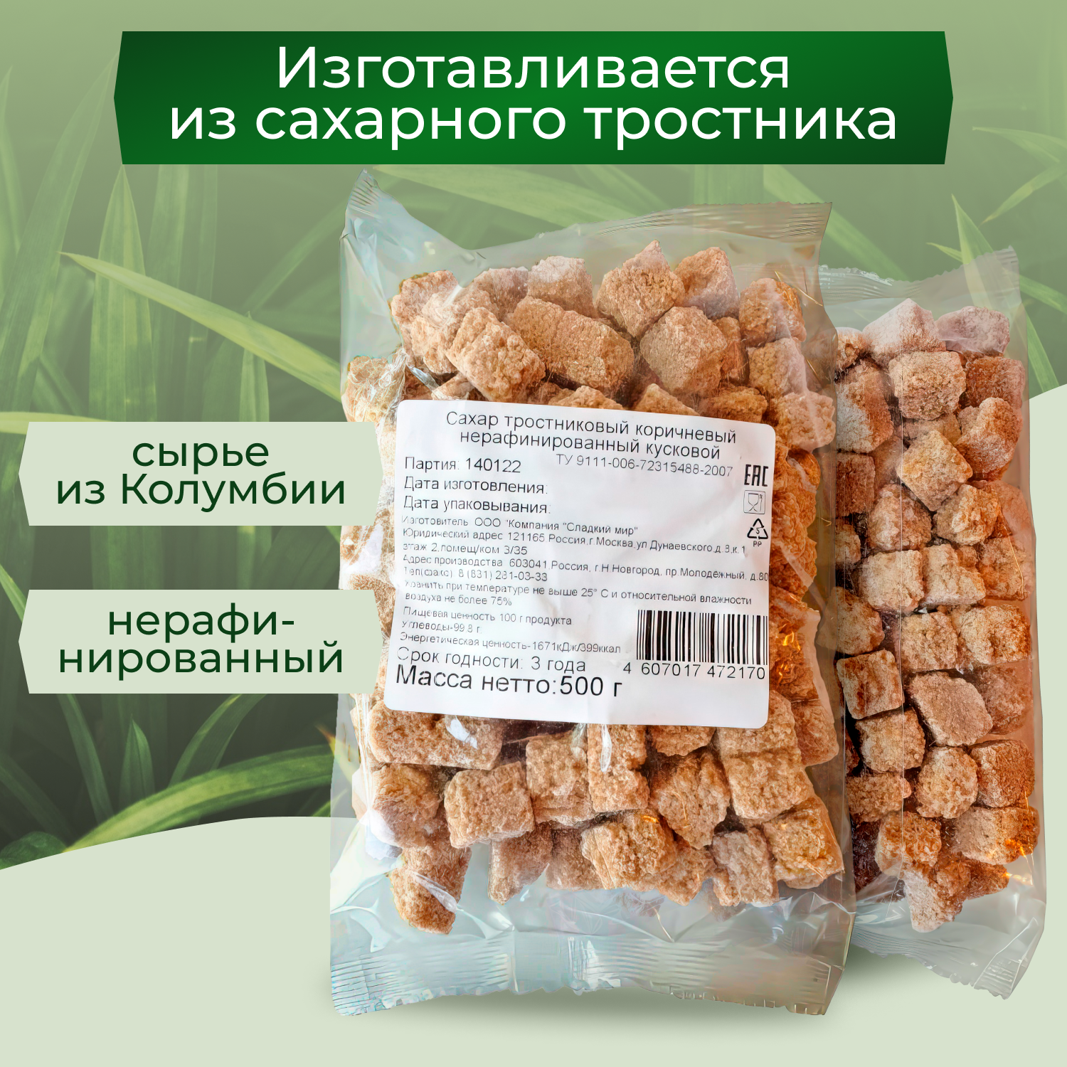 Сахар тростниковый кусковой коричневый нерафинированный, 500г х 2 шт. интересное: