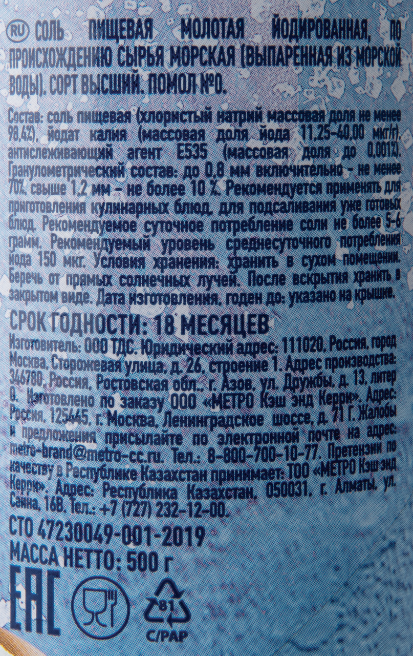 Соль морская Metro Chef помол № 0 высший сорт 500 г интересное: