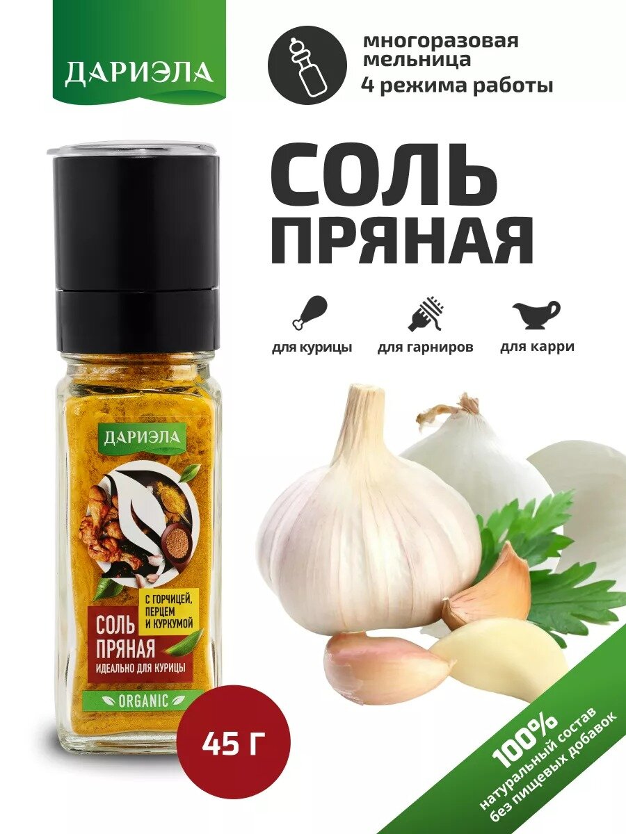 Соль ДАРИЭЛА "Пряная", ручная мельница, морская, с пряностями, 45 г интересное:
