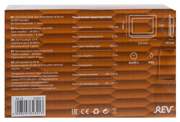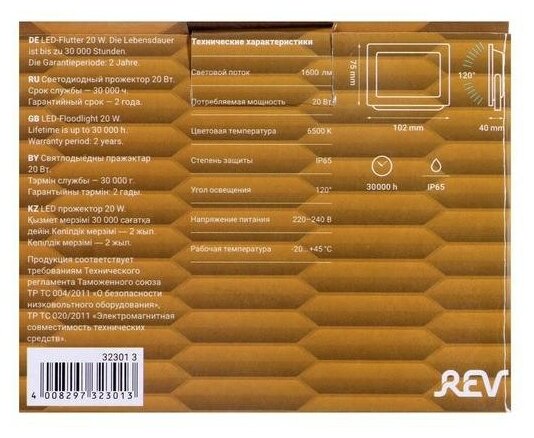 REV Прожектор светодиодный REV, 20 Вт, 6500 К, 1600 Лм, IP65