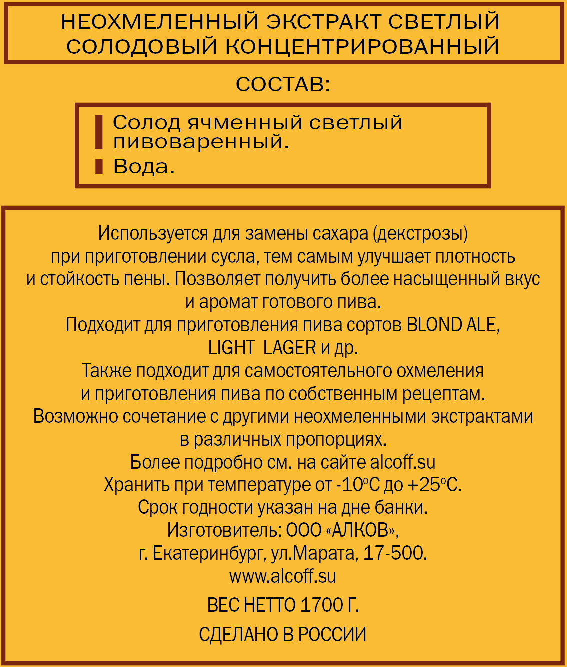 Солодовый экстракт для пива ALCOFF "MALT EXTRACT LIGHT", светлый, неохмелённый, 1,7 кг"