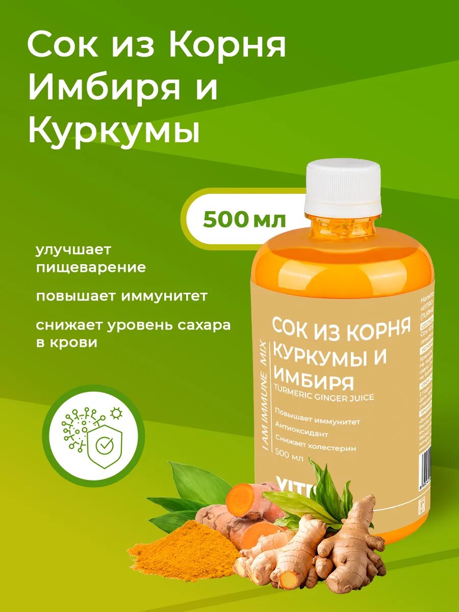 Купить Напиток сокосодержащий из корня Имбиря и Куркумы 500 мл антиоксидант, улучшение пищеварения и иммунитета Vitro Naturals