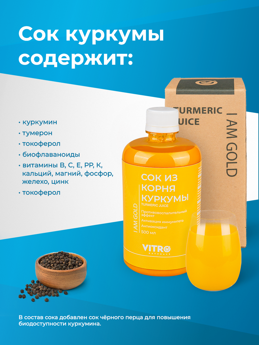 Напиток сокосодержащий из корня Имбиря и Куркумы 500 мл антиоксидант, улучшение пищеварения и иммунитета Vitro Naturals