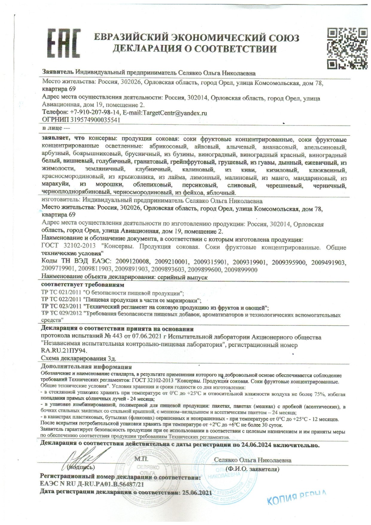 Концентрированный Сок Клюквенный "Только СОК" набор моновкус 6 шт по 300 г