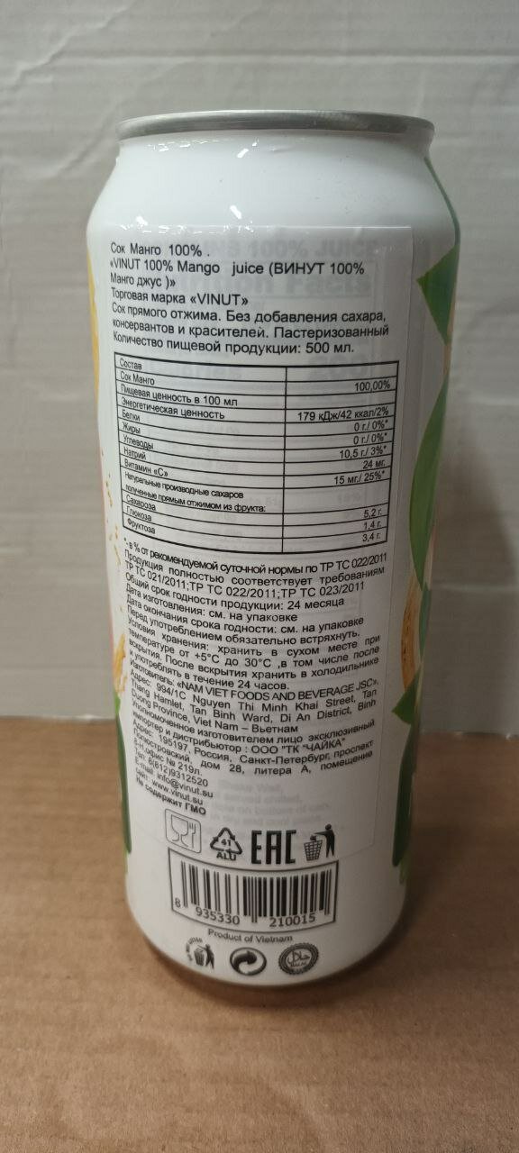 Сок Прямого отжима VINUT 100% MANGO (Винут Манго) 0,5л. 6 штук интересное: