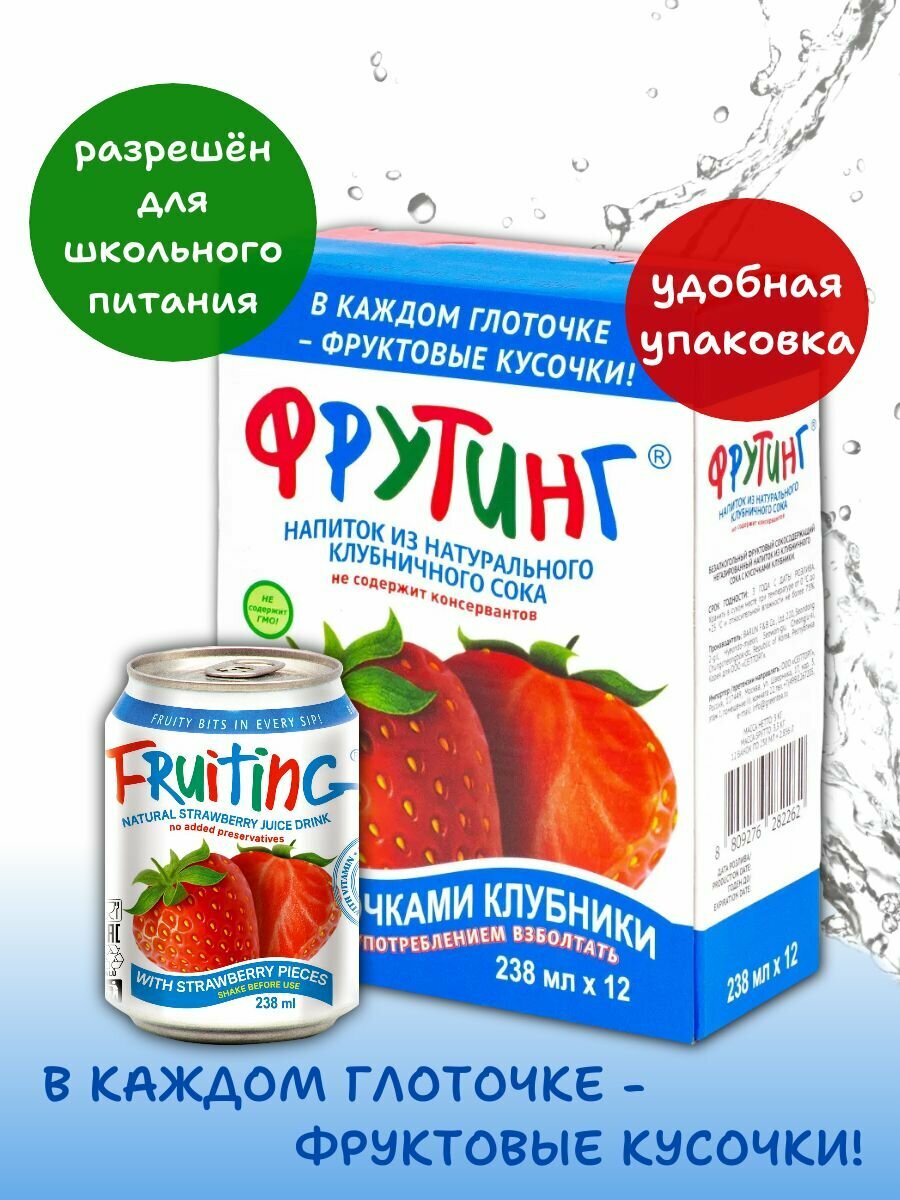 Ниже Вы можете прочитать отзывы на Напиток из сока клубники Фрутинг с кусочками настоящей клубники и витамином С, без газа,12 шт*238 мл, ознакомится с подробными характеристиками, посмотреть интересные обзоры и фотографии на Напиток из сока клубники Фрутинг с кусочками настоящей клубники и витамином С, без газа,12 шт*238 мл.