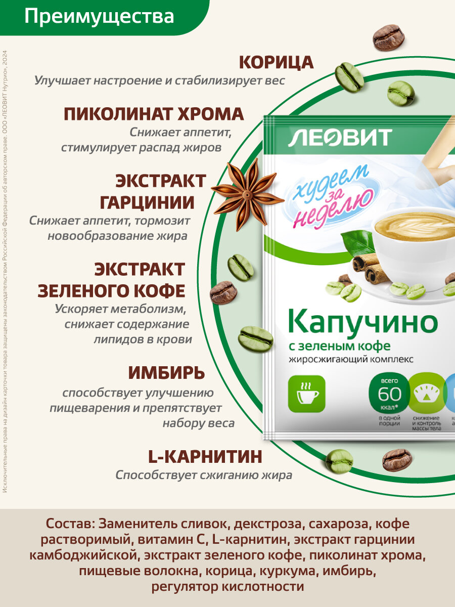 Капучино в пакетиках жиросжигающий ассорти 60 шт Худеем за неделю ЛЕОВИТ быстрого приготовления интересное: