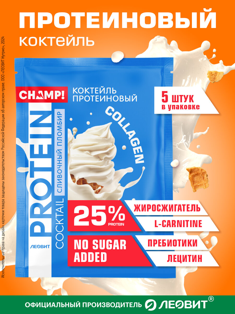 Купить Коктейль протеиновый сливочный пломбир 5 шт 30 гр без сахара Champ! ЛЕОВИТ 25% белка быстрого приготовления в пакетиках